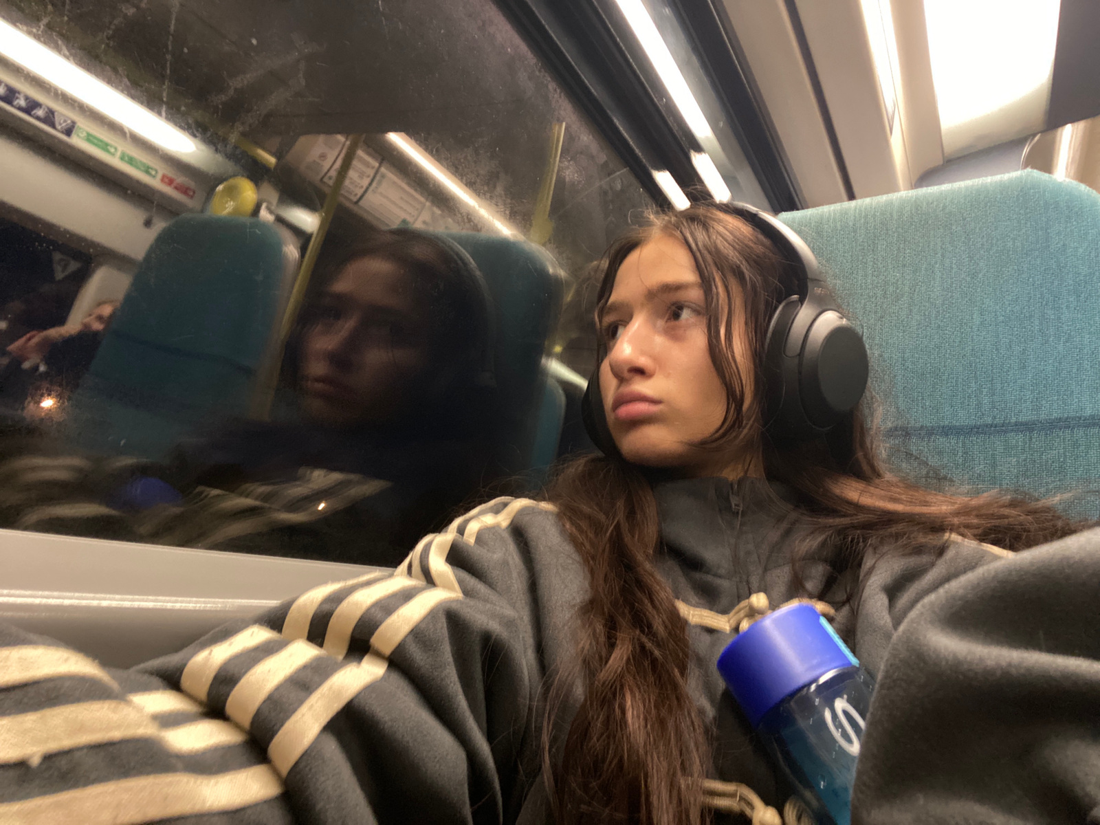 A young woman with brown hair wearing headphones is resting her head against a window on public transportation. She is wearing a dark-colored hoodie with white stripes on the sleeves. Next to her is a…read more