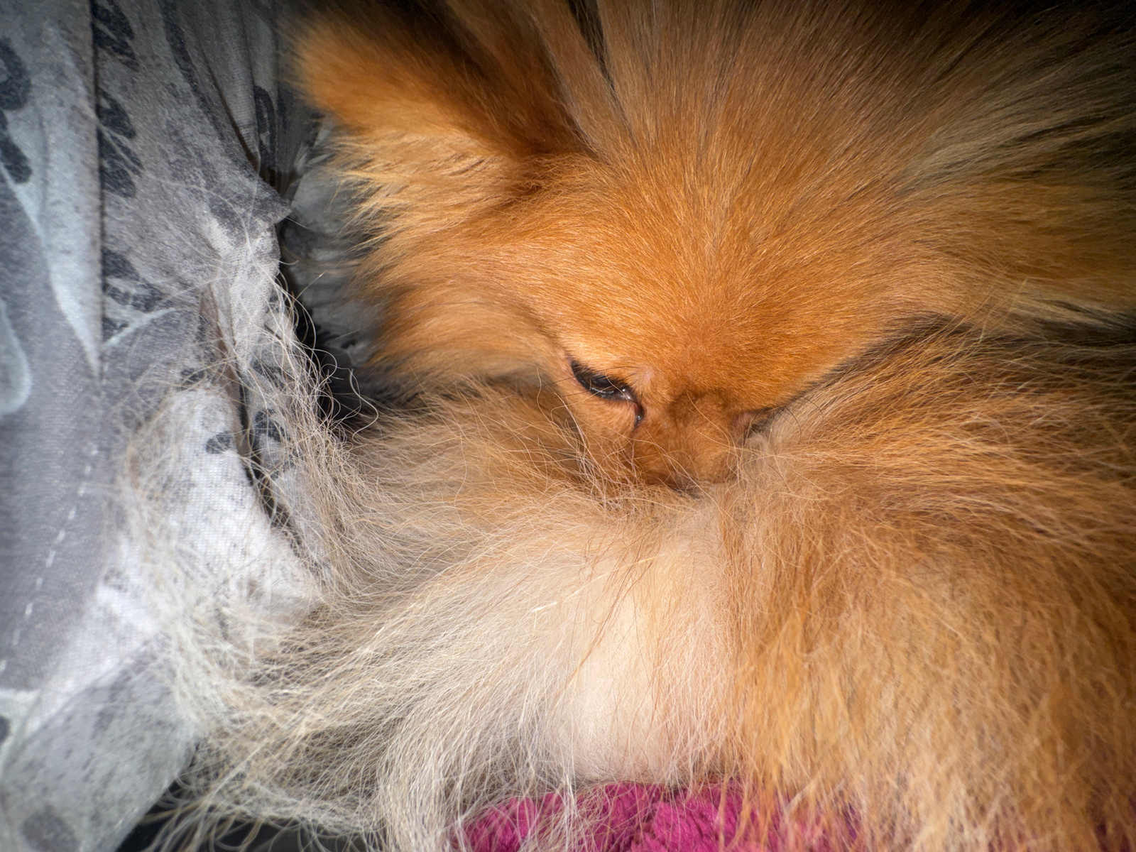 A close-up photograph shows a small, golden-brown Pomeranian dog curled up and sleeping. The dog's head is tucked into its tail, which is primarily tan with some lighter, nearly white fur. One eye is…read more