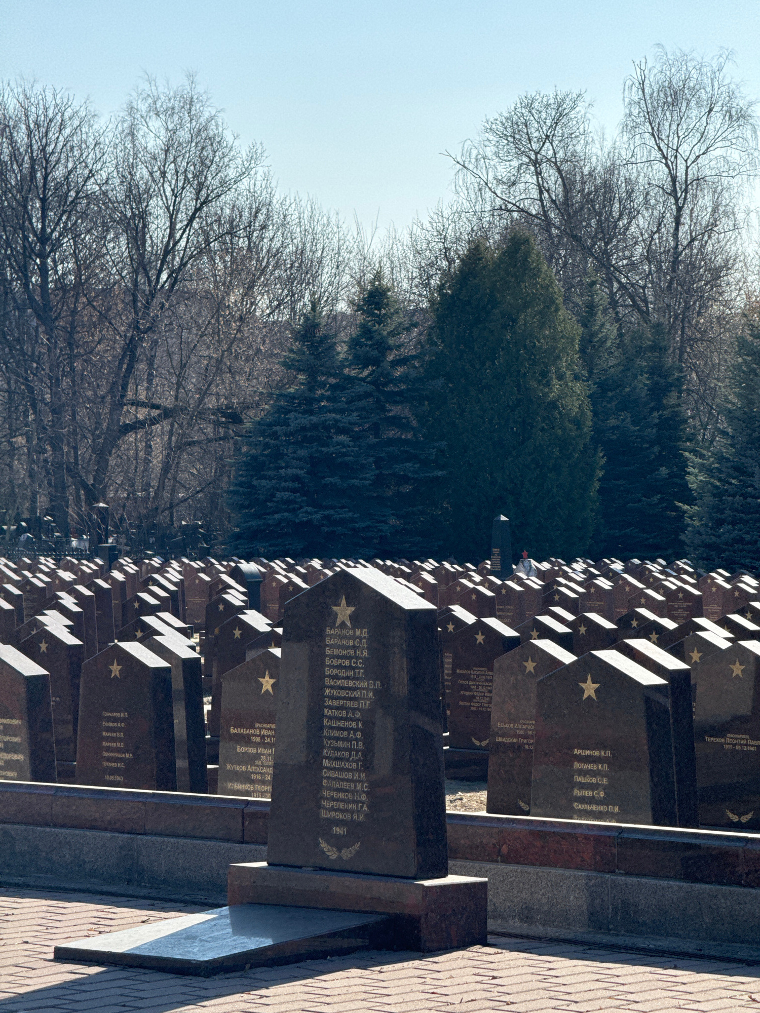 The image shows a row of dark, rectangular gravestones in Moscow, Russia. Each stone is engraved with a gold star and Cyrillic script, likely names and dates of deceased individuals. The gravestones a…read more