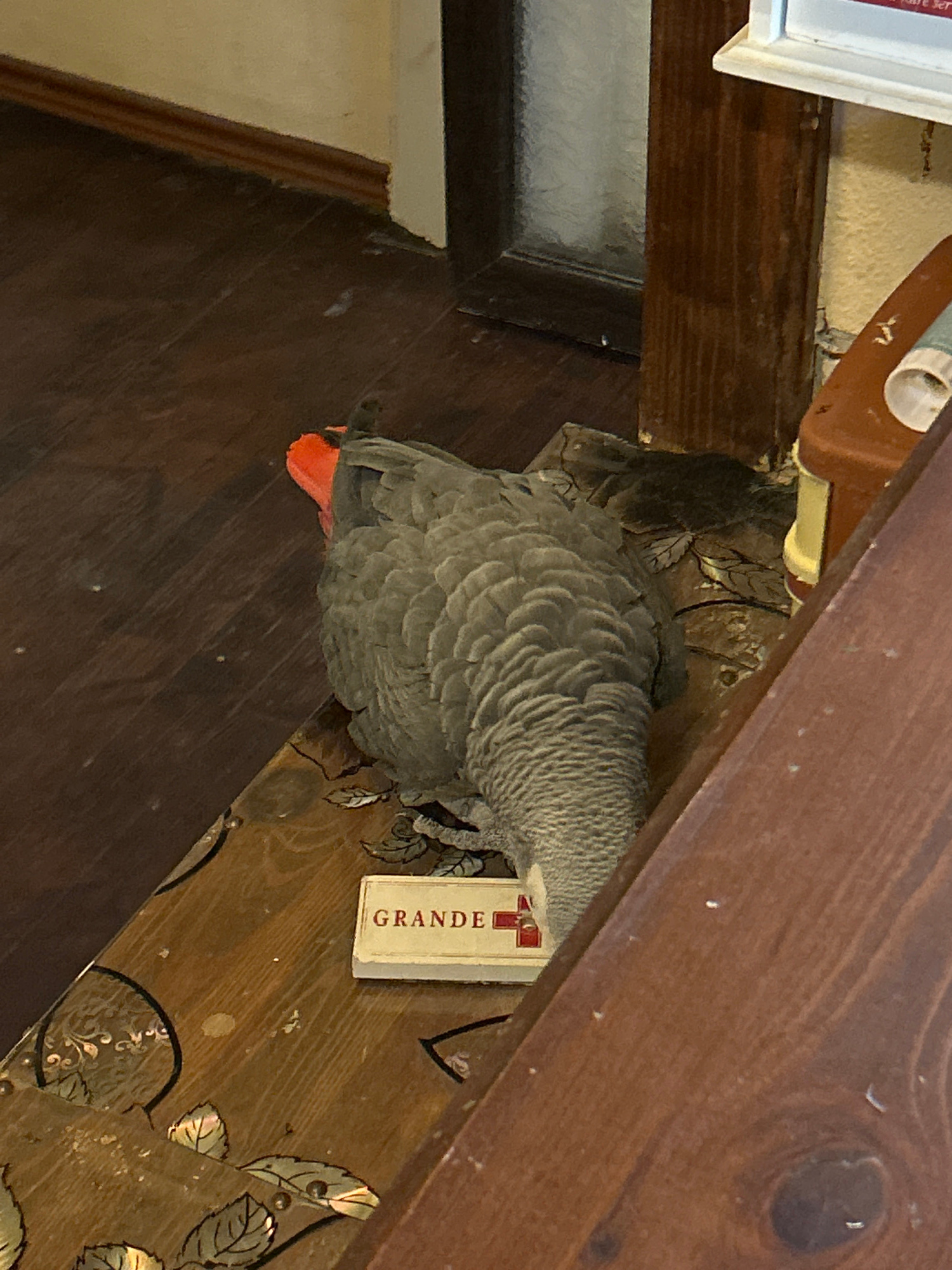 An African Grey Parrot is perched or resting on a decorated wooden surface in what appears to be an indoor setting in Strelcha, Bulgaria. The parrot, identifiable by its grey plumage and distinct red…read more