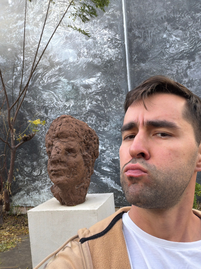 The image portrays an outdoor scene in Tel-Aviv, Israel, featuring a male subject and a sculpted bust. The man, positioned on the right and cropped from the chest up, is light-skinned with short darkβ¦read more
