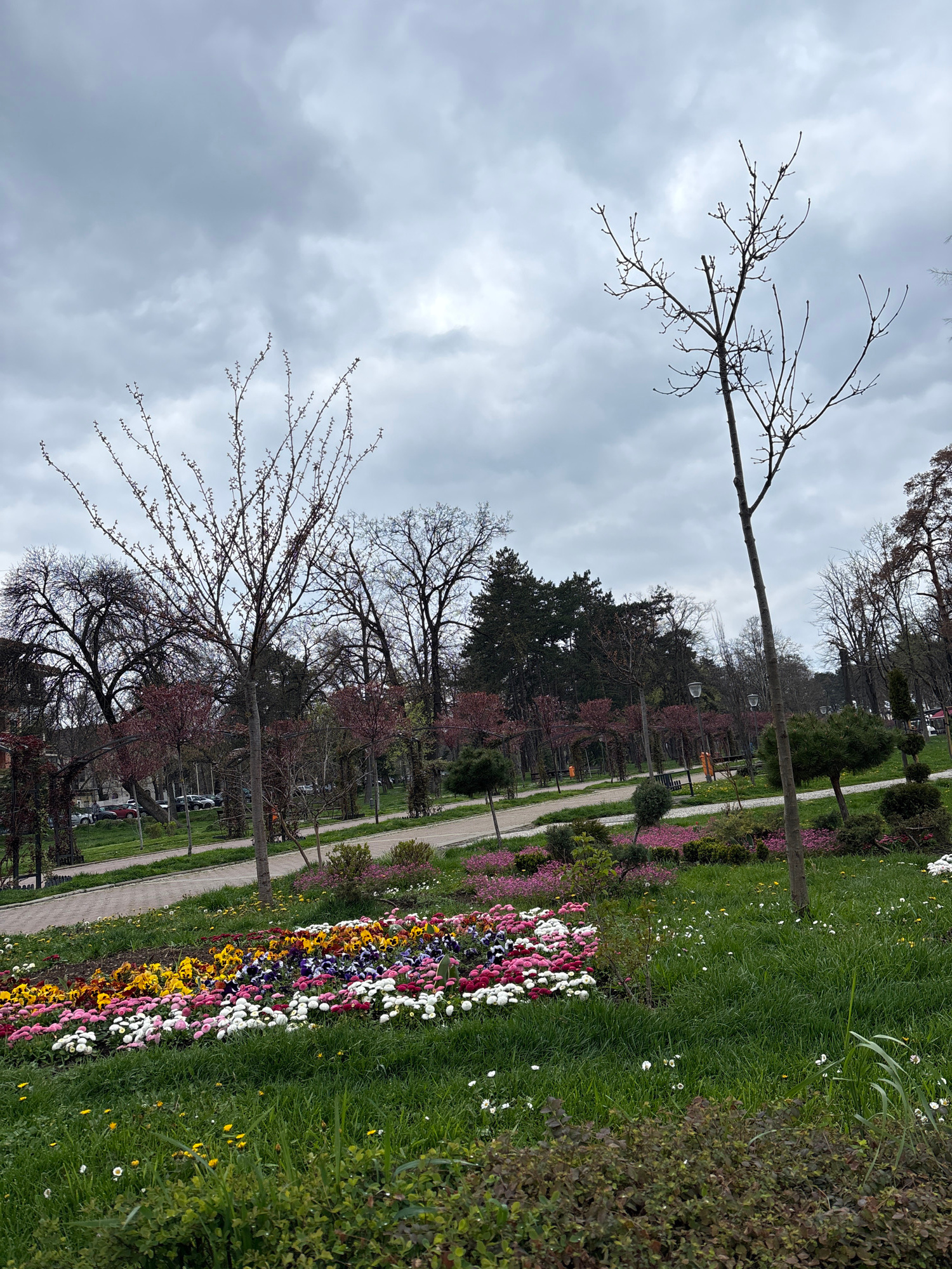 The image depicts a park scene in Kragujevac, Serbia, under an overcast sky. A pedestrian walkway runs through the park, bordered by flowerbeds with colorful blooms and interspersed with trees. The tr…read more