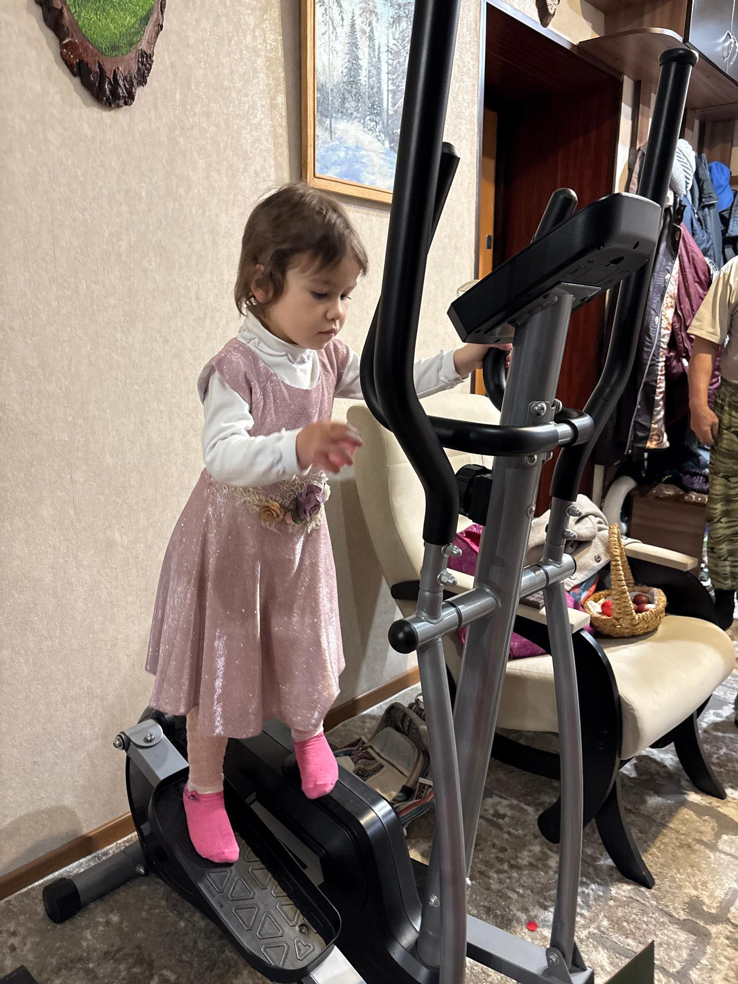 A toddler in a pink dress and pink socks stands on the pedal of an elliptical machine, holding onto the handlebar. The environment is cluttered, with furniture and miscellaneous items visible in the b…read more