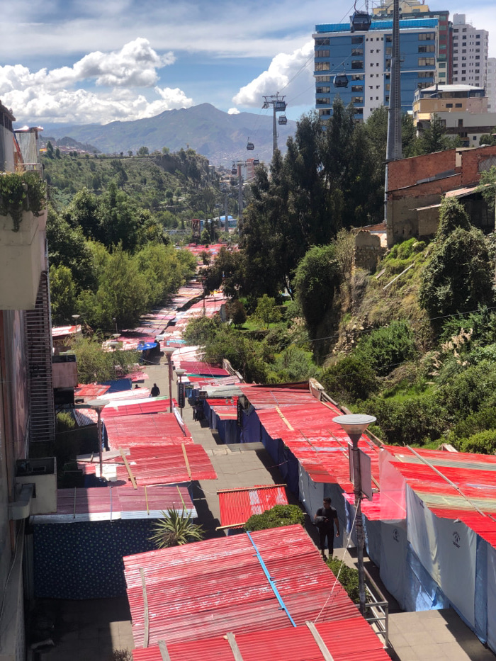 The image depicts an outdoor market street in La Paz, Bolivia, viewed from an elevated perspective looking downhill. The scene is dominated by numerous market stalls lining a paved pathway, predominan…read more