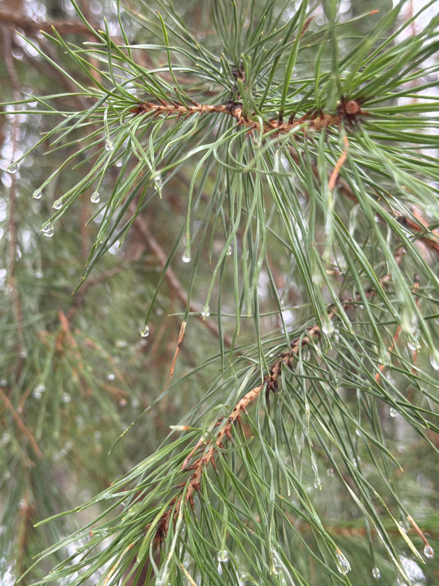 The image features a close-up view of pine needles covered in small water droplets or ice crystals. The needles are green and arranged in clusters along brown branches. The background is blurred, sugg…read more
