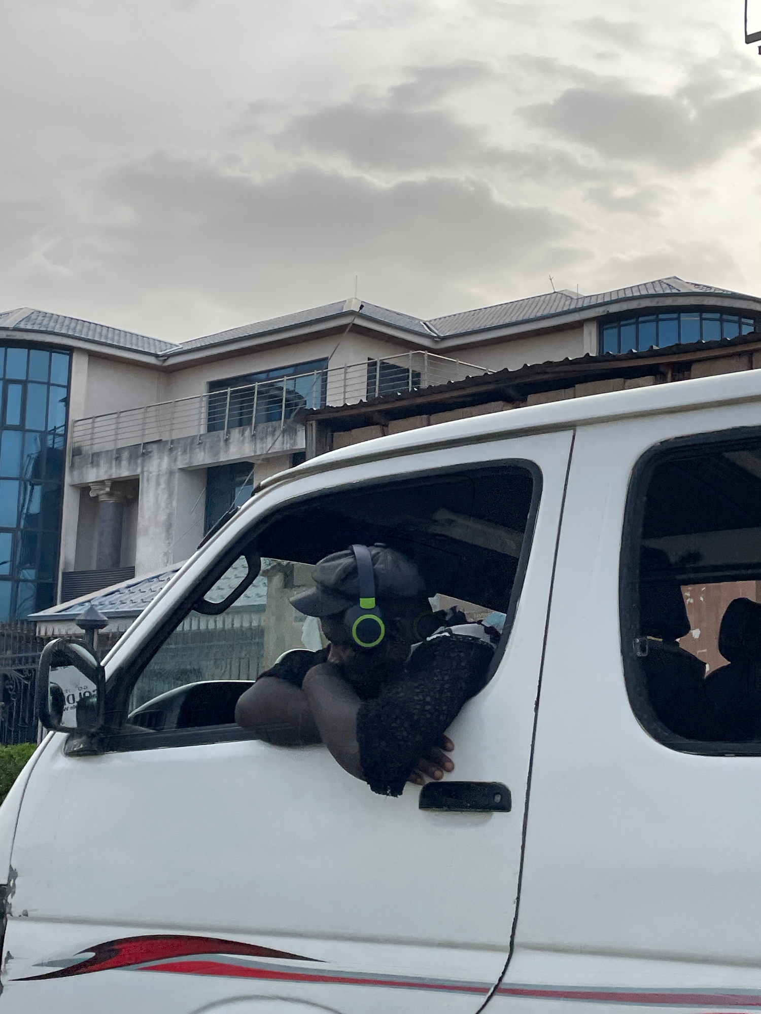 The image is an eye-level shot of a man sitting inside a white vehicle, possibly a van, in Jos, Nigeria. The man is wearing a dark cap and headphones with green accents. He has his arms resting on the…read more
