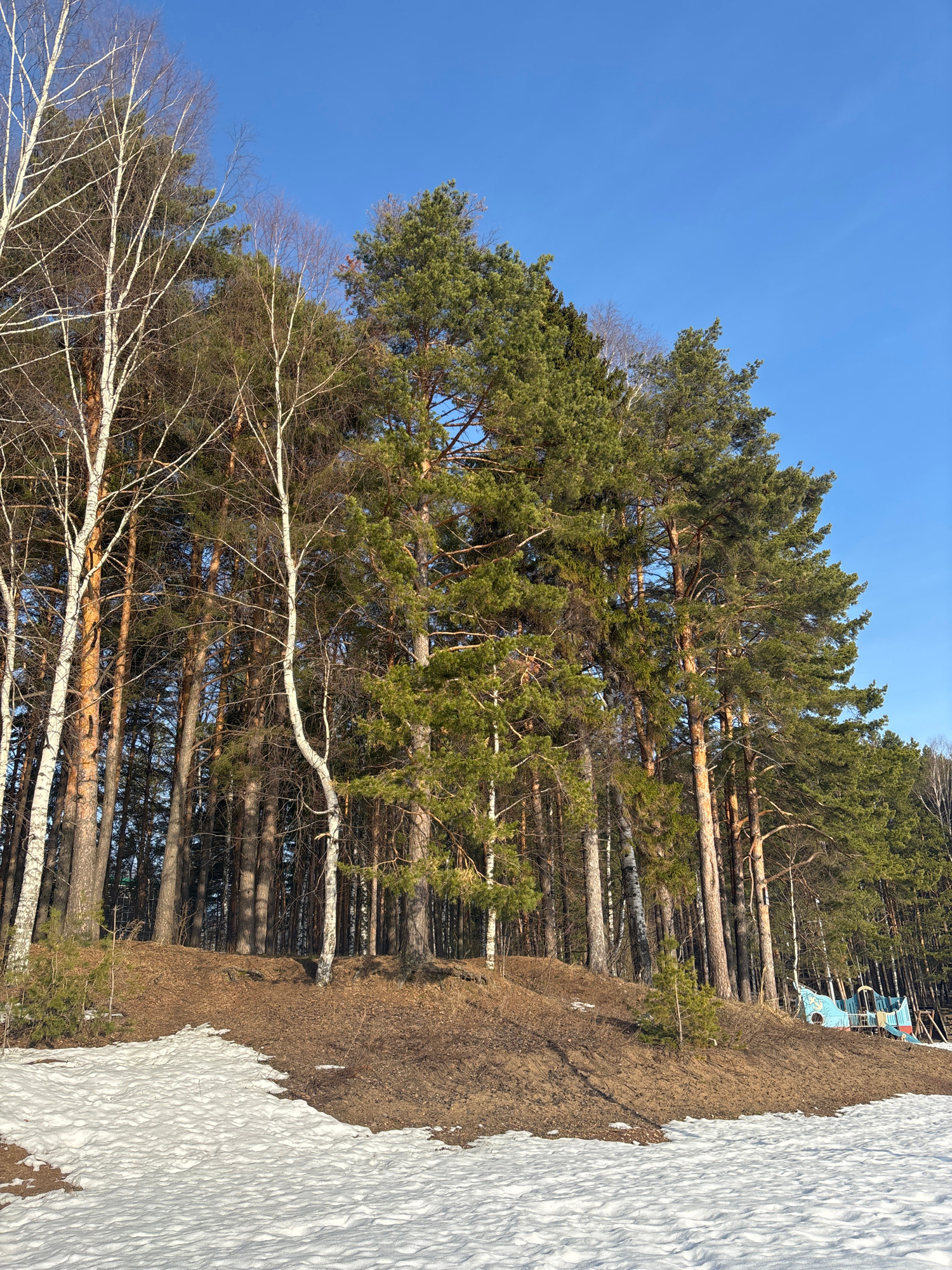 The image shows a section of a forest during winter in Chaikovsky, Russia. The trees are primarily tall pines mixed with birch trees, some of which are bare-branched. Patches of snow remain on the gr…read more