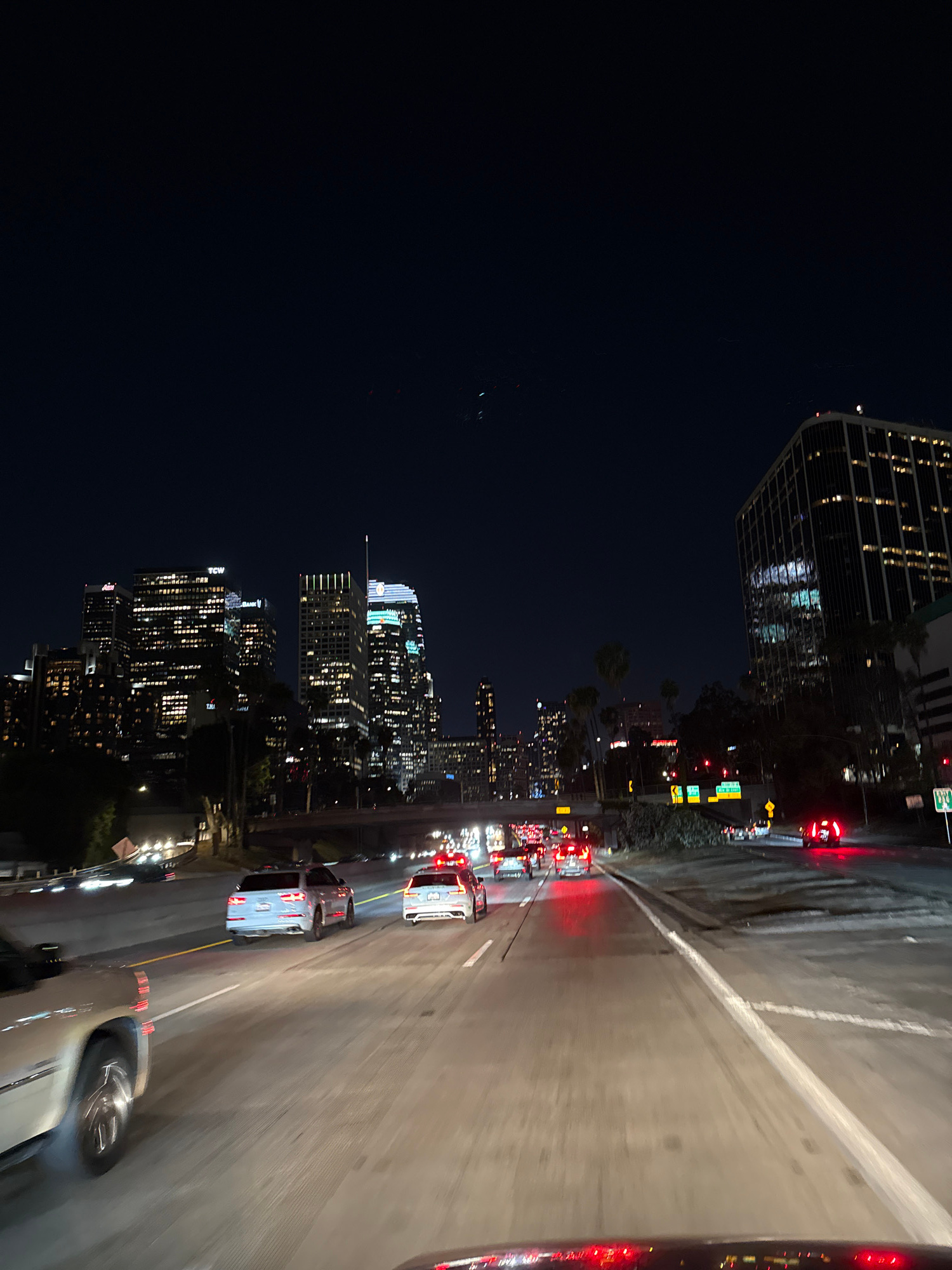 The image depicts a nighttime scene of a highway in Los Angeles, California. The view is from a moving vehicle, looking towards the cityscape. The highway is illuminated by headlights and streetlights…read more