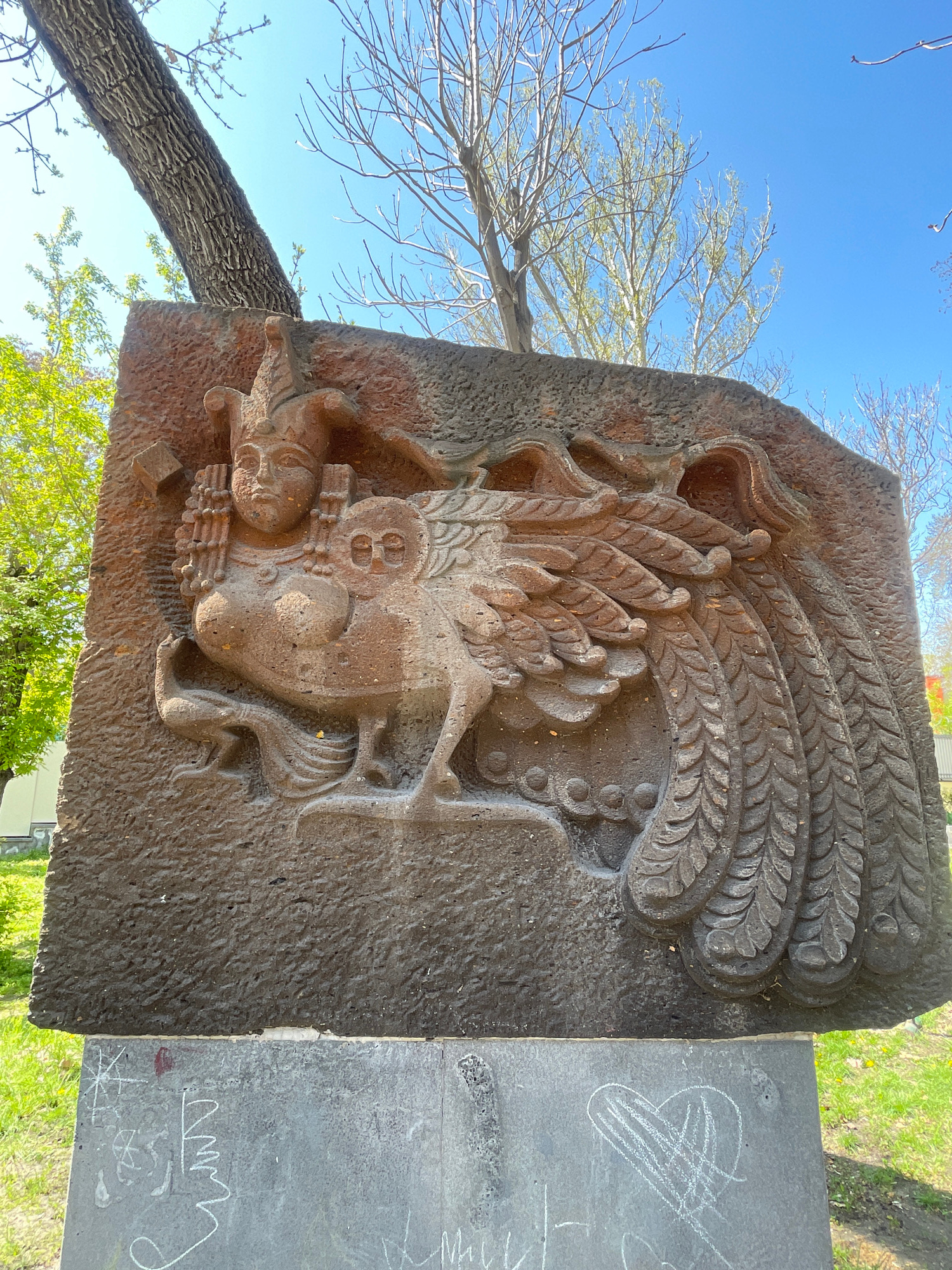 A large, intricately carved stone block, likely made of dark, coarse-grained volcanic rock such as basalt, stands outdoors under a clear blue sky in Yerevan, Armenia. The carving depicts a stylized, m…read more