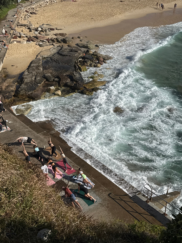 From an elevated perspective, the image showcases a coastal scene. A beach borders turbulent ocean waves. A concrete structure parallels the shoreline, where several individuals practice yoga on mats.…read more