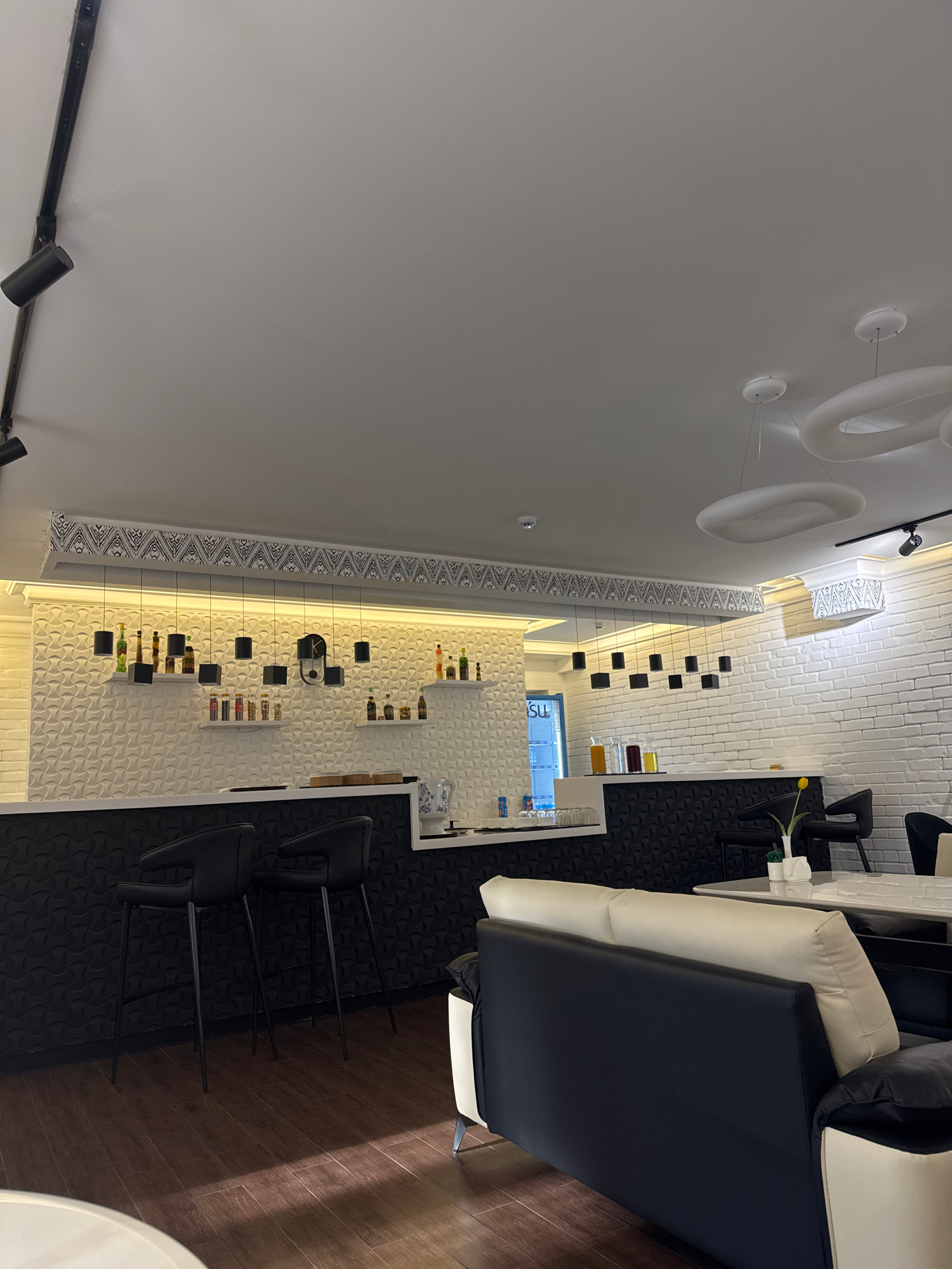 The image presents an interior view of what appears to be a commercial space, possibly a salon or retail area, in Tashkent, Uzbekistan. The space is characterized by a modern aesthetic with a predomin…read more