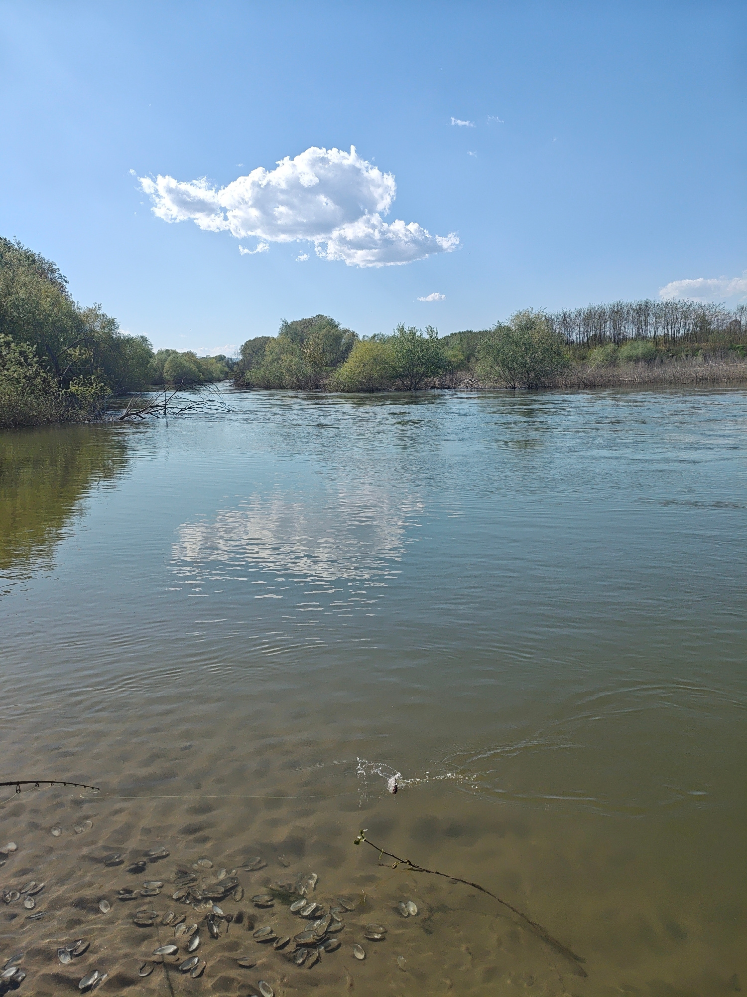 The image depicts a river scene, likely located within the Municipal Unit of Skoutari, Greece, characterized by a wide expanse of water flanked by dense, verdant vegetation on both sides. The river su…read more