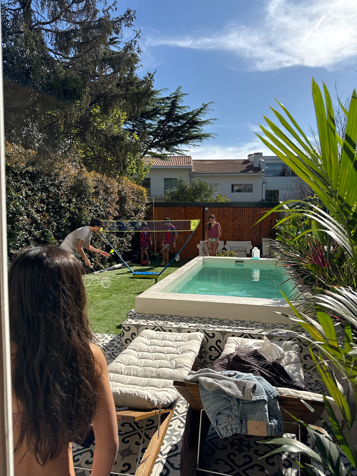 The image shows an outdoor scene, likely a backyard, with various elements suggesting a relaxed, residential setting. The view is partially obscured by a person's head and hair in the foreground, with…read more