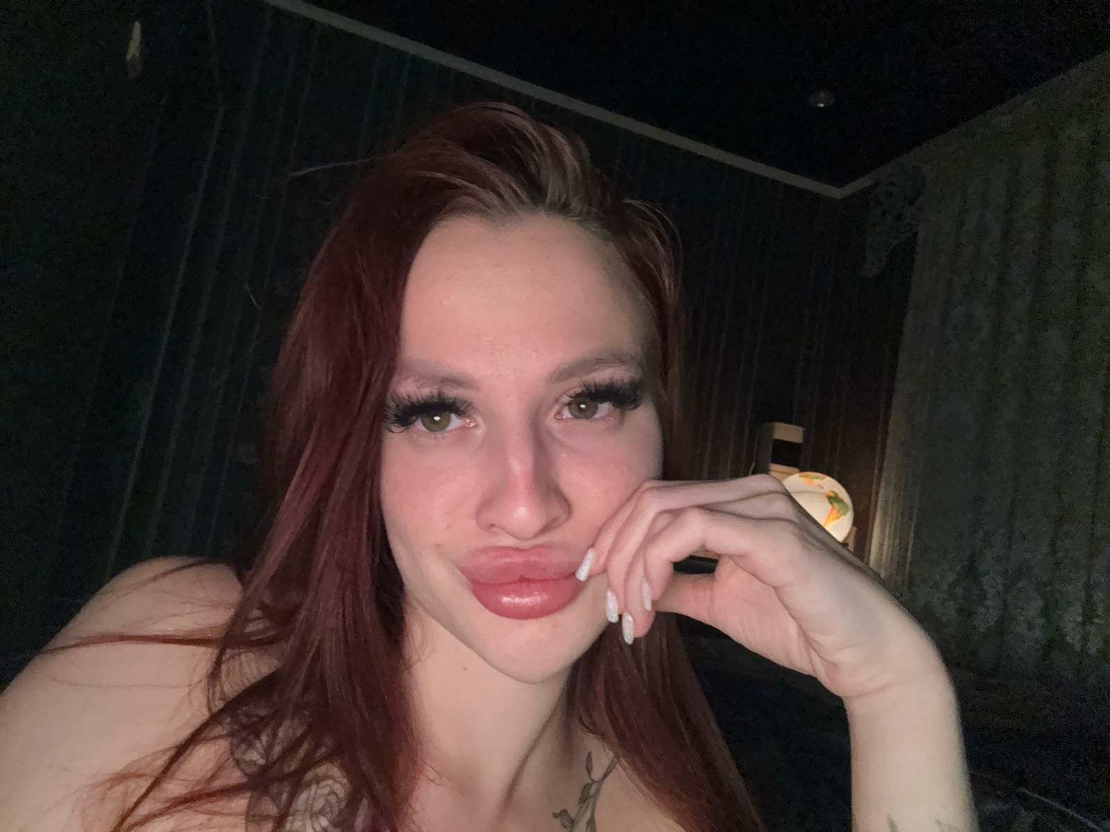 A woman with red hair is seen from an upside-down perspective. She has fair skin, long eyelashes, and glossy lips. Her left hand, with white nail polish, is raised near her face. Her upper body and sh…read more