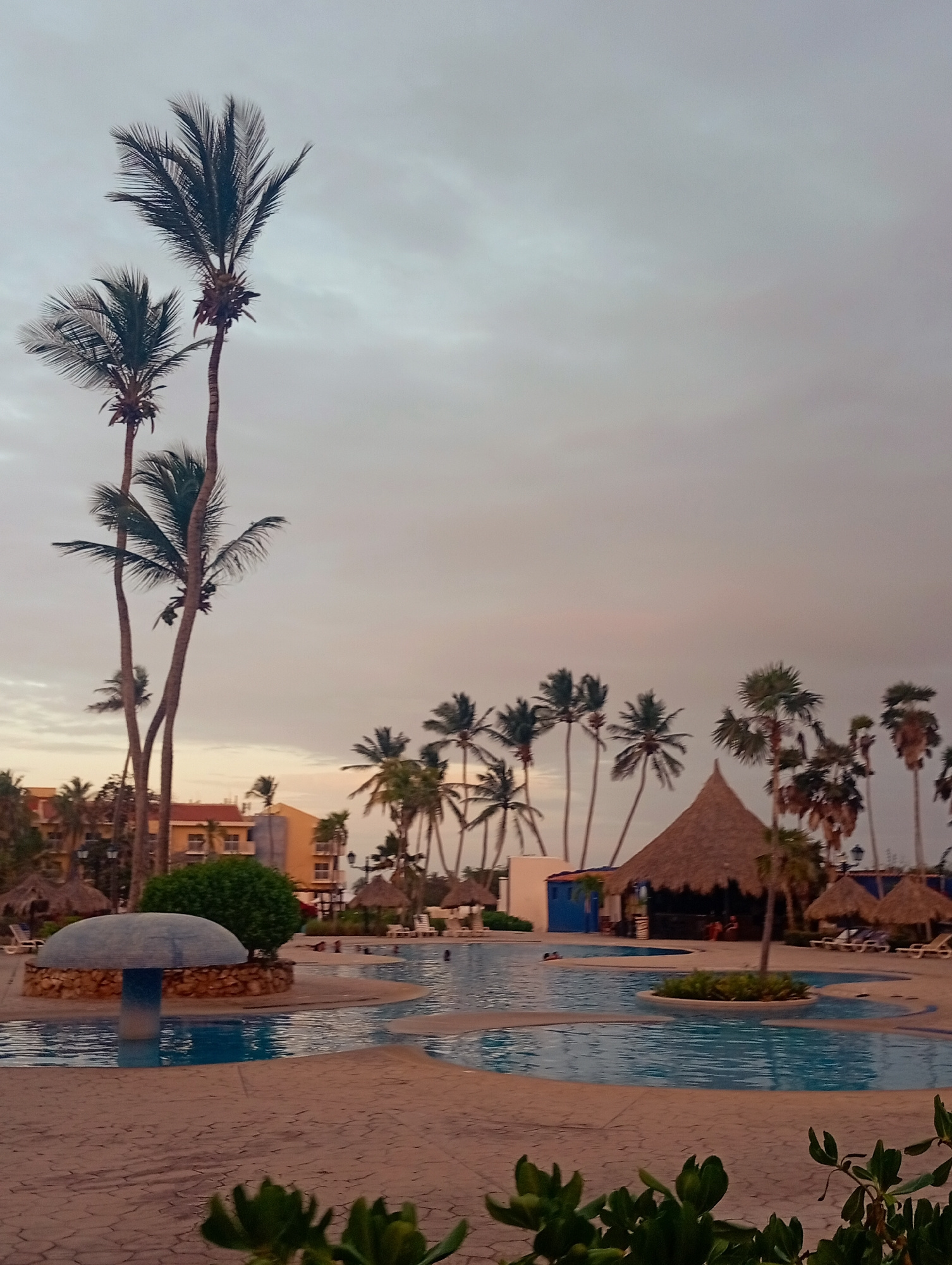 The image shows a resort pool scene at Playa El Agua, Venezuela, under a cloudy sky with a hint of sunset. In the foreground, there are plants and a mushroom-shaped fountain. A multi-tiered pool occup…read more