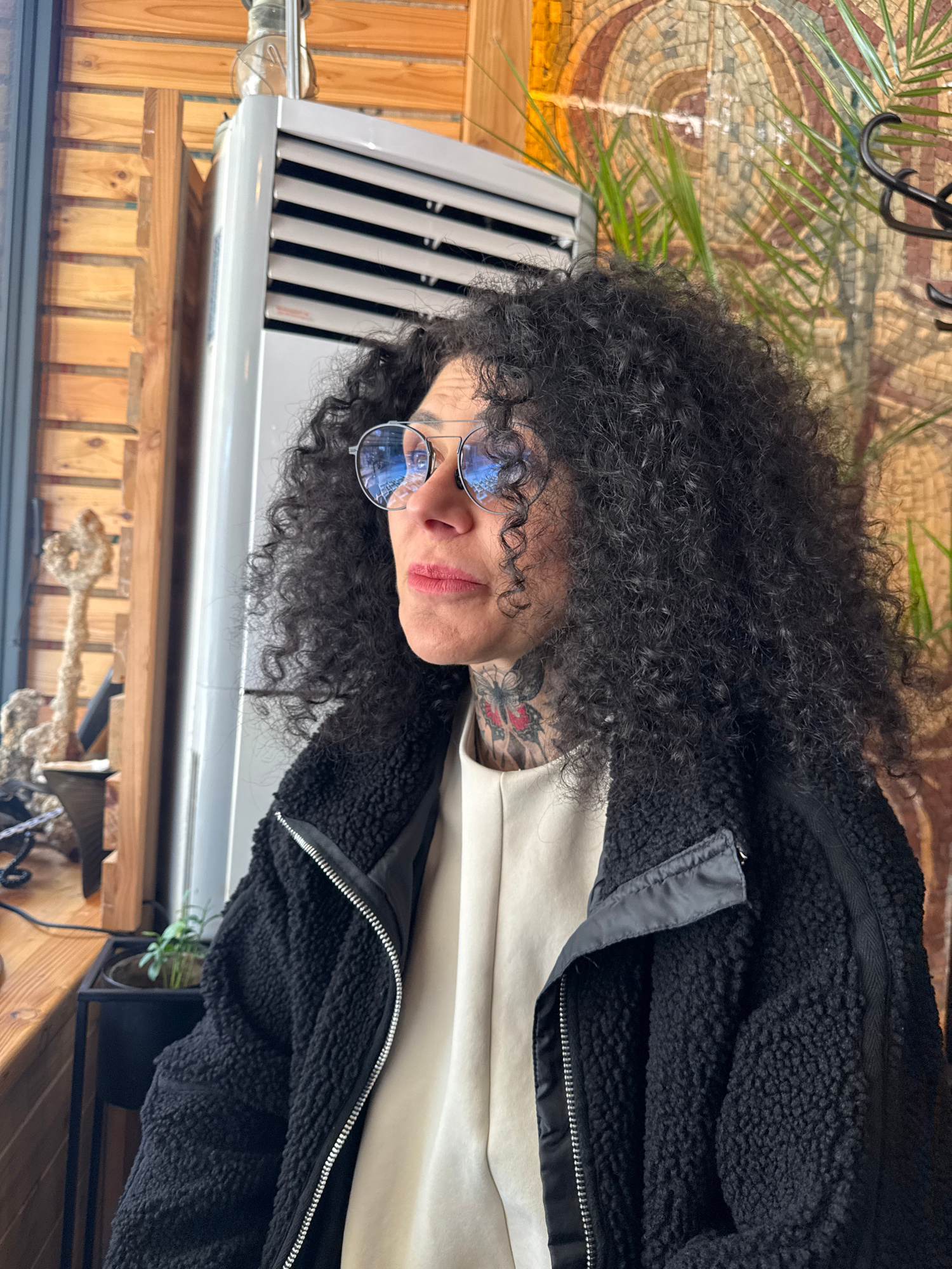 A person with curly dark hair and glasses is shown from the chest up. The person is wearing a light-colored shirt underneath a dark, textured jacket with a silver zipper. The person has a visible tatt…read more
