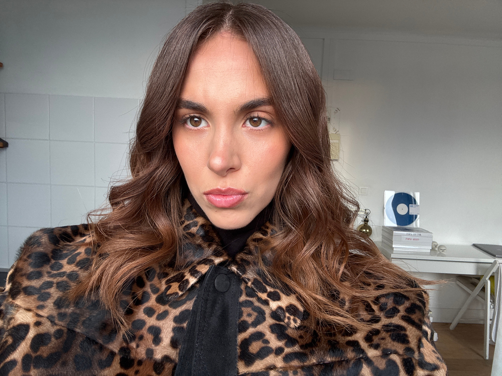 A young woman with brown hair and a leopard-print jacket is posing upside down. The background features a white wall and a shelf with a stack of books and a record. The location is unclear but may be…read more