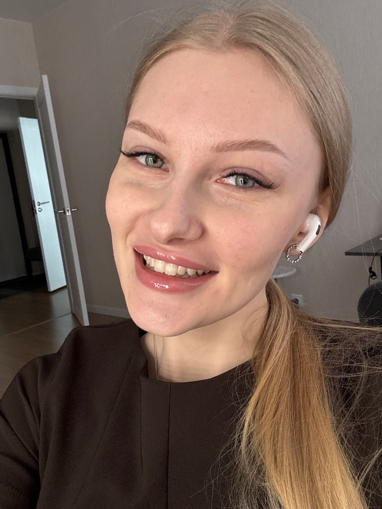 A close-up, slightly angled shot depicts a smiling young woman with fair skin, blonde hair pulled back, and light green eyes. She is wearing a white earbud with a dangling, circular charm. Her lips ar…read more