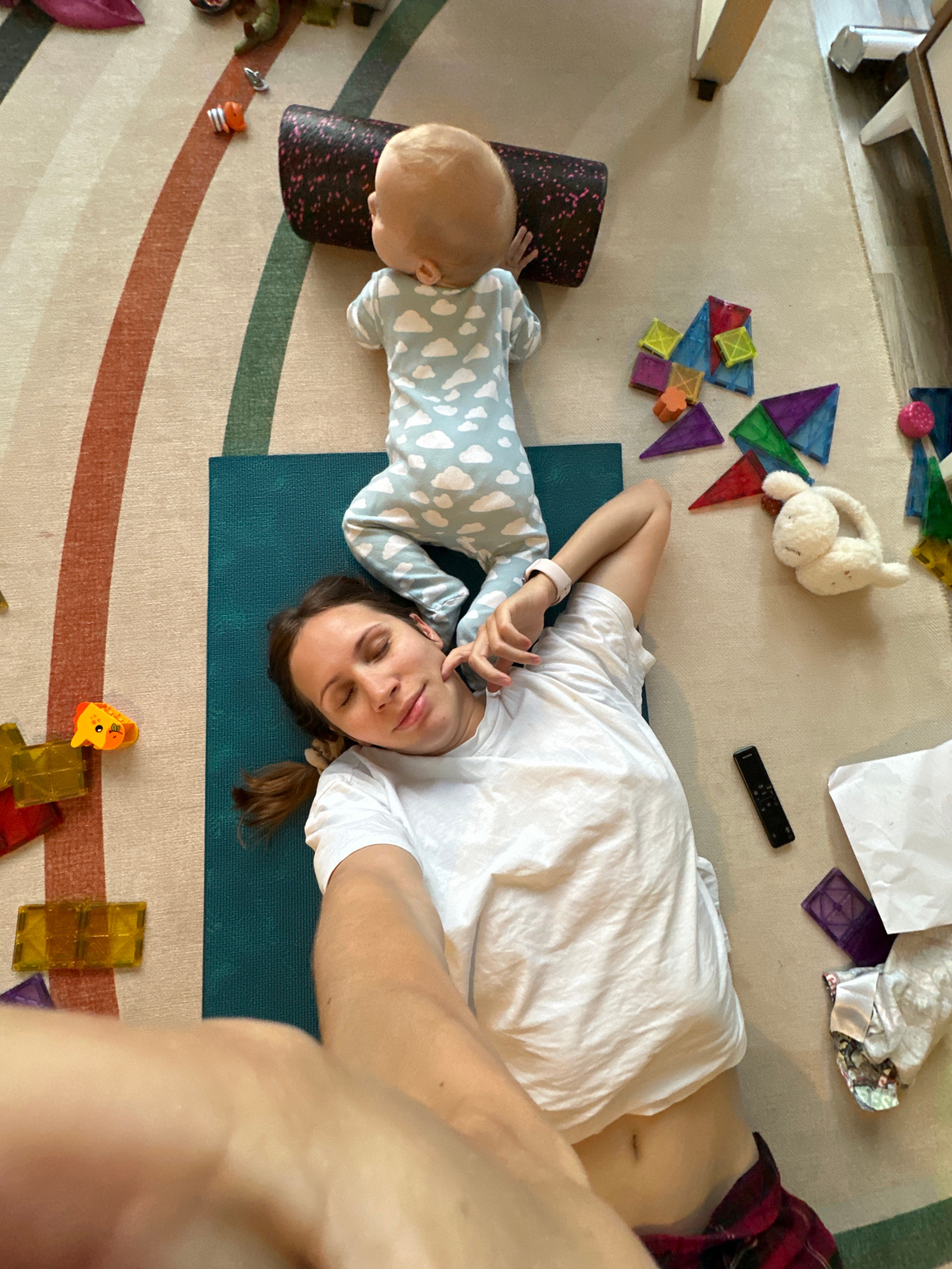 A top-down shot shows a woman lying on a blue yoga mat on a multi-colored rug. She wears a white t-shirt and has brown hair in a low ponytail. A baby in a cloud-patterned onesie lies to her left, with…read more