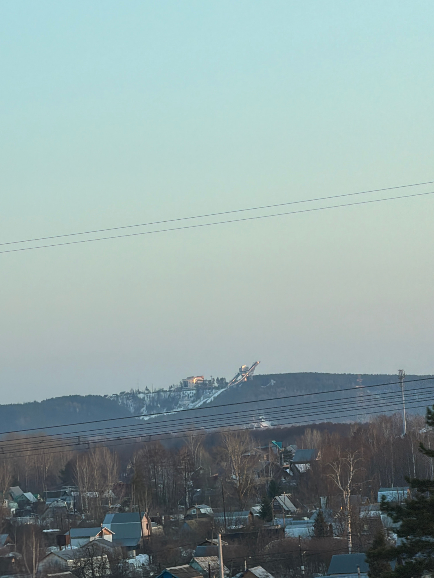 The image presents a panoramic view of a residential and natural landscape in Noviy, Russia, under a clear, pale blue sky. In the foreground, a dense cluster of detached houses with varied roof color…read more
