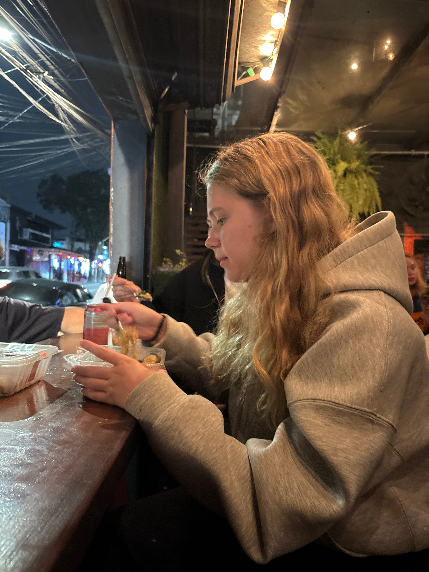 A young woman with long, wavy blonde hair and wearing a grey hooded sweatshirt leans over a table. She appears to be handling food in clear plastic containers. The scene takes place outdoors at night.…read more