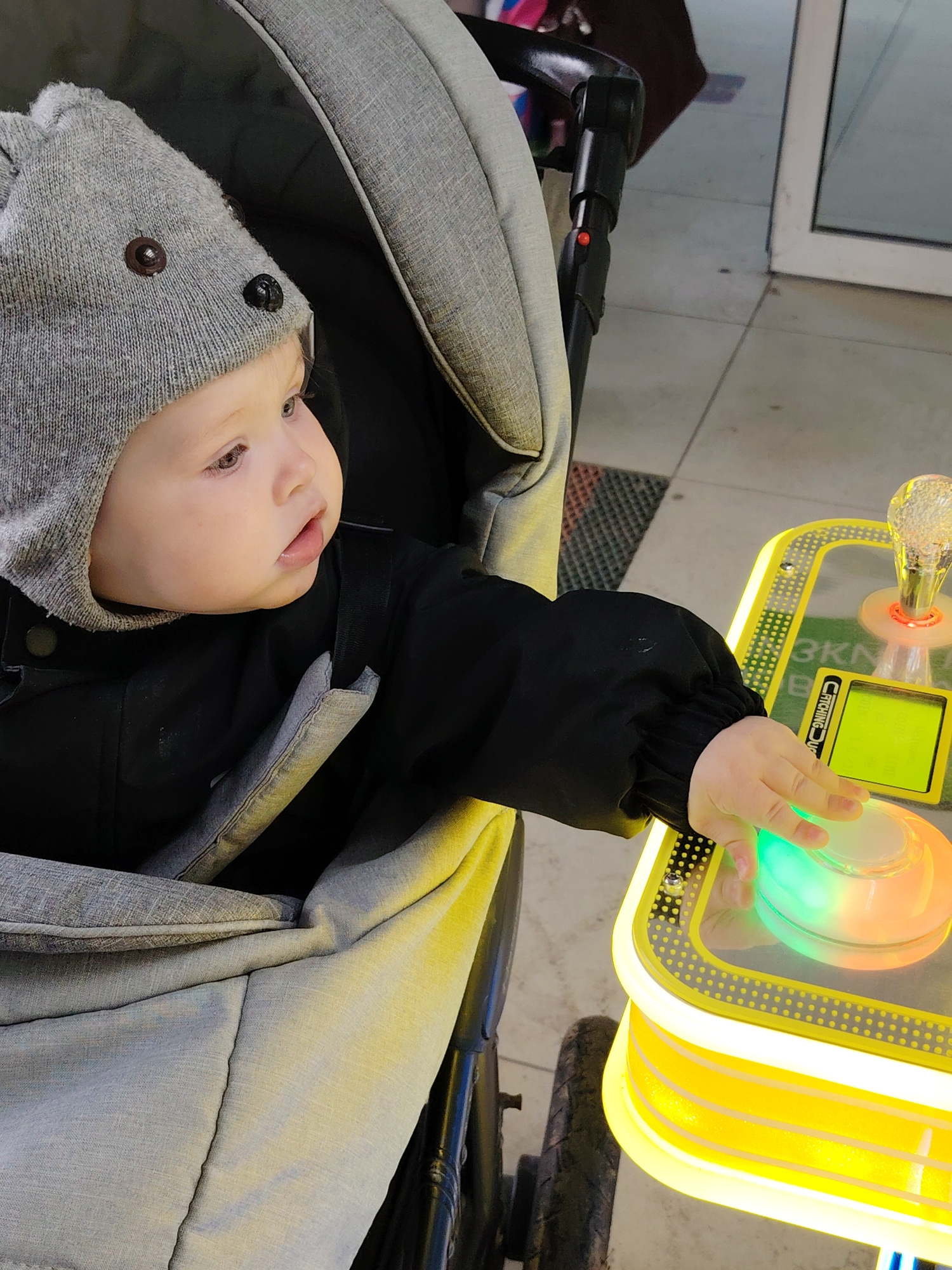 A baby wearing a grey knit hat with button eyes is seated in a stroller, interacting with an illuminated arcade game. The game is yellow with a clear plastic top, featuring a large, circular button th…read more