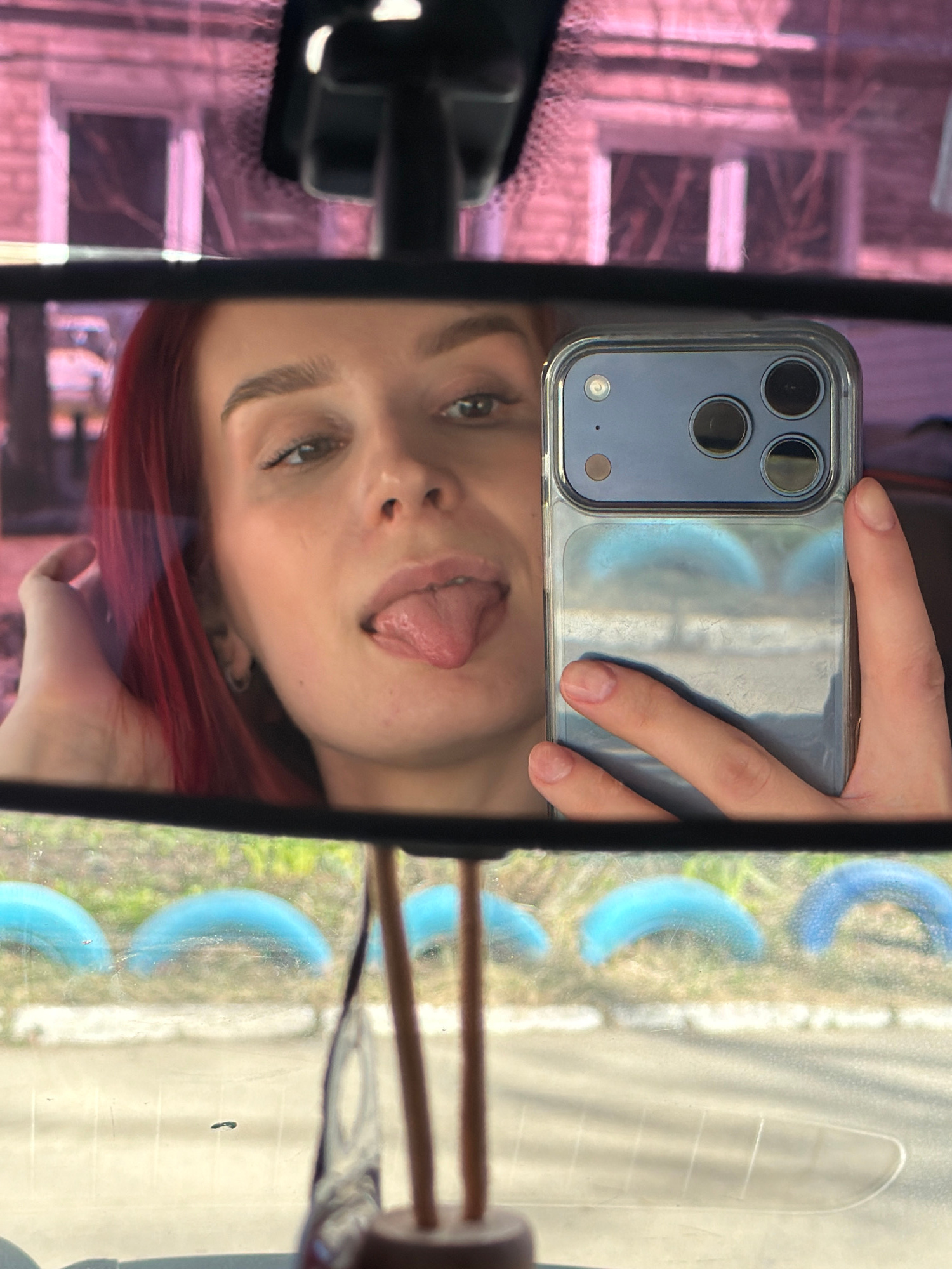 The image depicts a selfie taken in the rearview mirror of a vehicle. A young woman with red hair is visible in the mirror's reflection. She is holding a smartphone with multiple camera lenses. Outsid…read more
