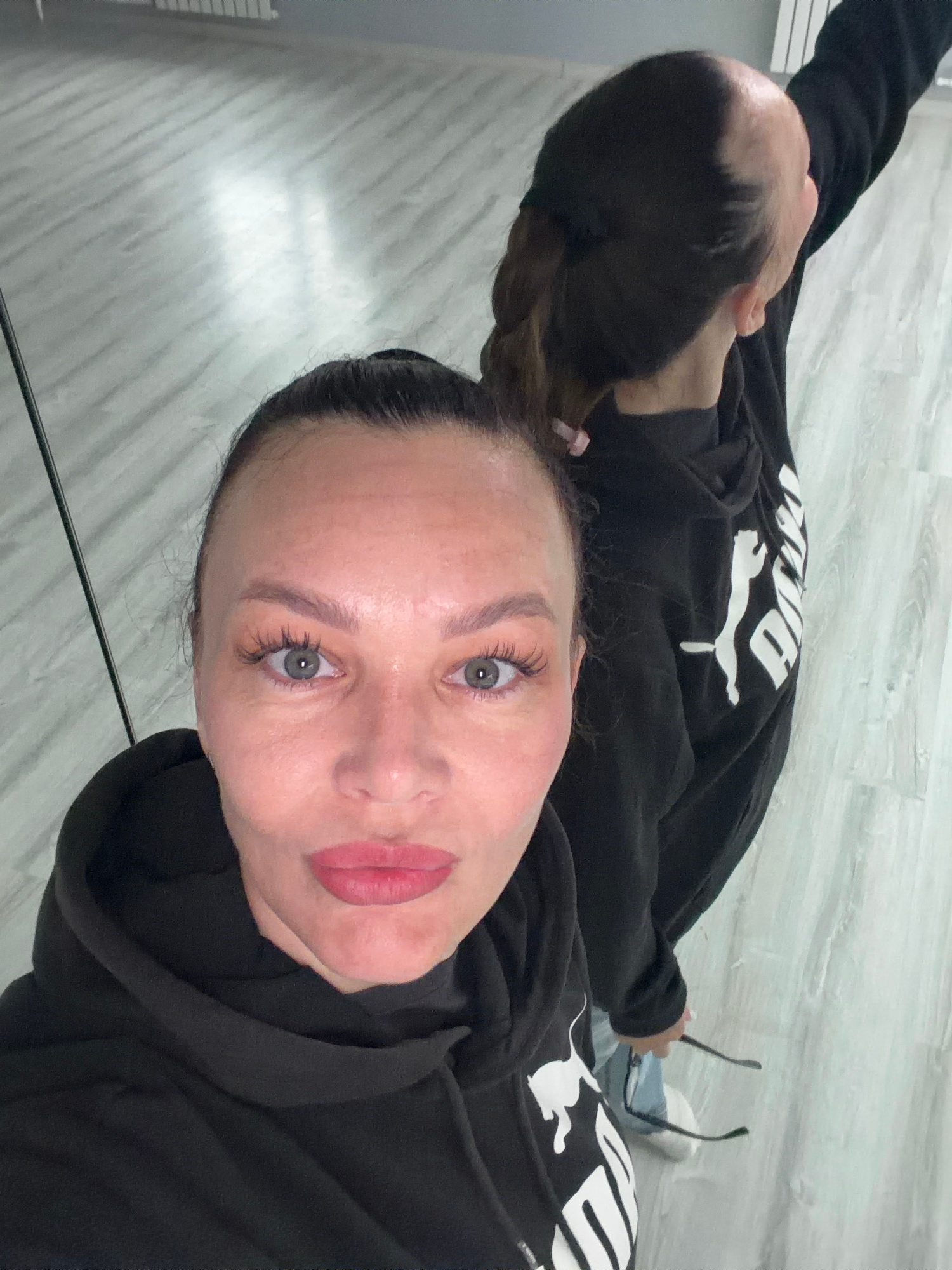 The image shows a selfie of a fair-skinned woman wearing a black Puma hoodie. She has light eyes and pink lipstick. The reflection in the mirror behind her reveals another angle of her and the hoodie,…read more