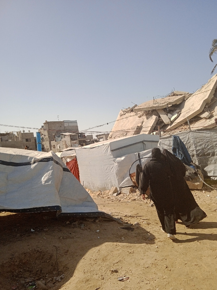 This image depicts an outdoor scene in Khan Yunis, Palestinian Territory, under a clear, pale blue sky. The ground in the foreground and midground is dry, sandy, and uneven, with scattered small debri…read more