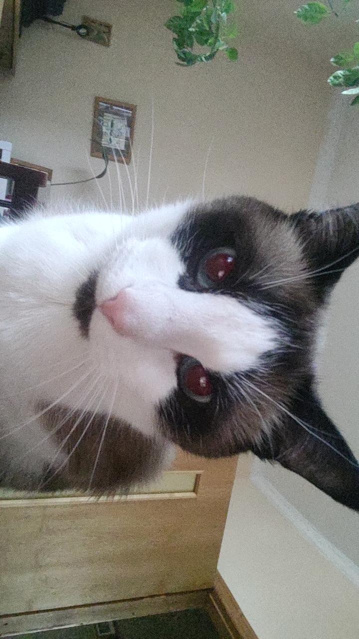 A close-up, high-angle shot captures a domestic cat resting comfortably indoors. The cat, likely a Ragdoll or a similar colorpoint breed, has distinct light blue eyes and a small pink nose. Its fur is…read more