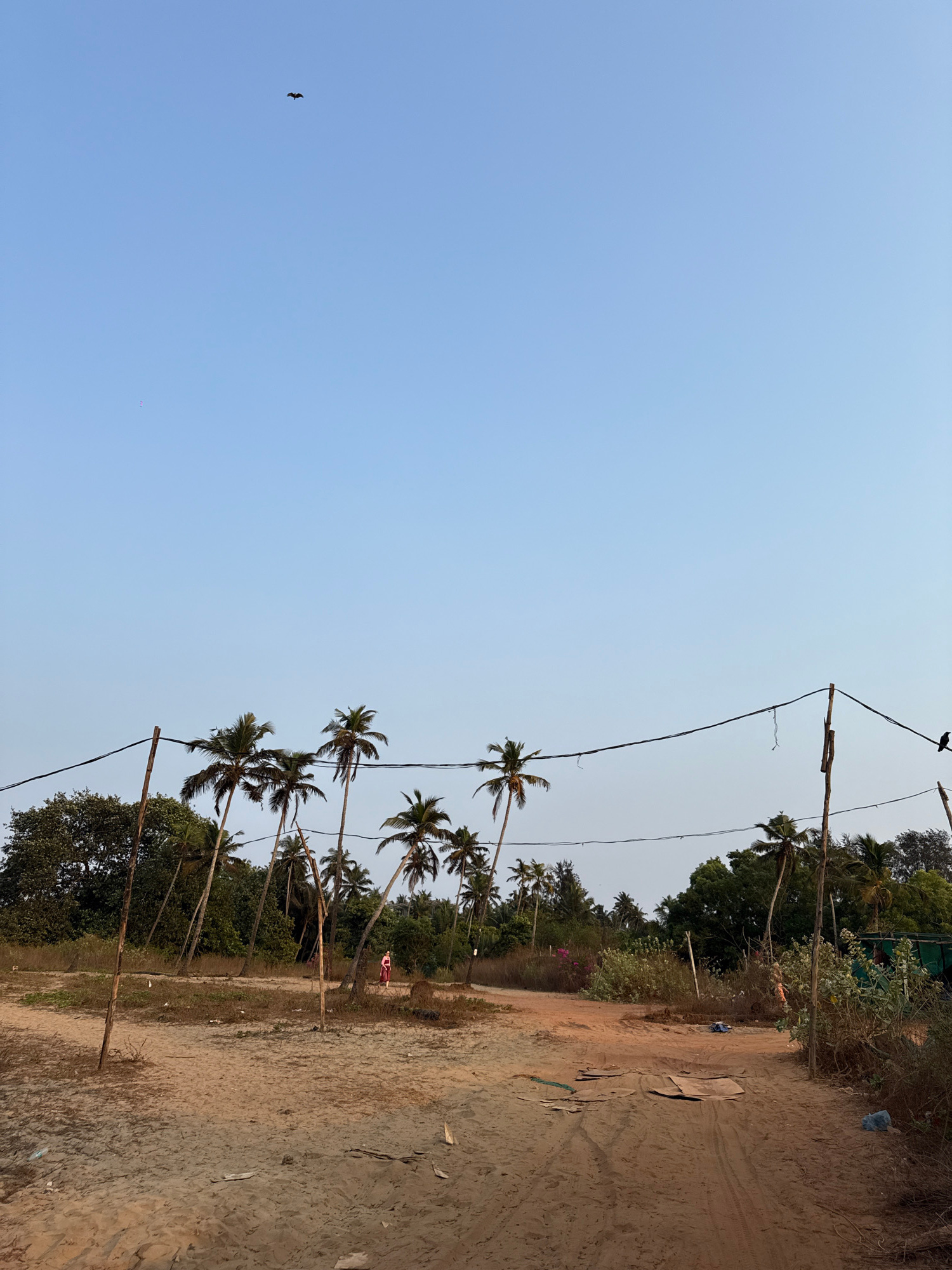 The image depicts a scene in Arambol, India. A dirt road occupies the right side of the frame, showing tire tracks and scattered debris. A line of palm trees runs parallel to the road, slightly angled…read more