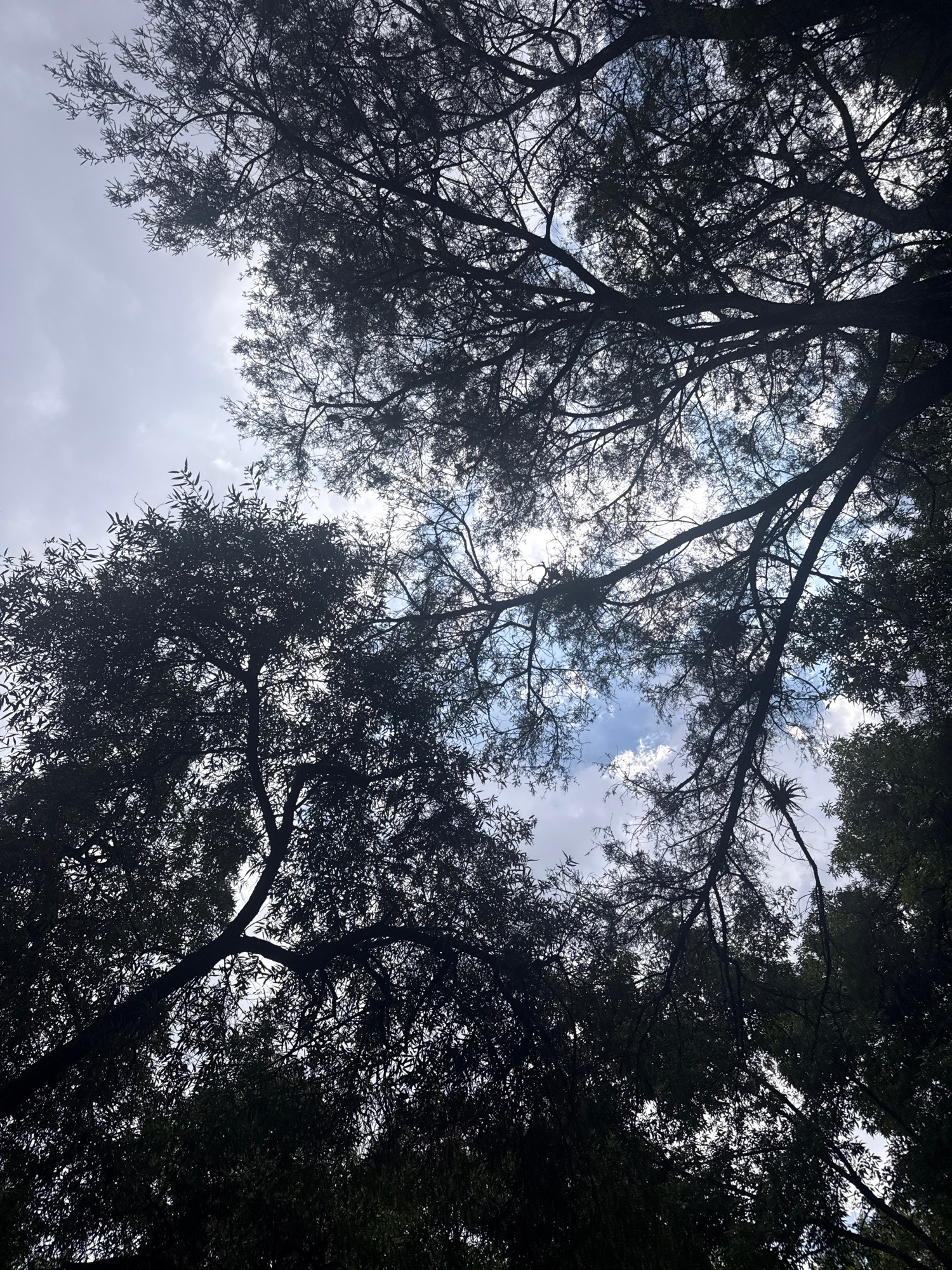 The image is a low-angle shot looking up through tree branches towards the sky. The trees are silhouetted against the cloudy sky, which appears to have patches of blue. One or more bromeliads (likely…read more