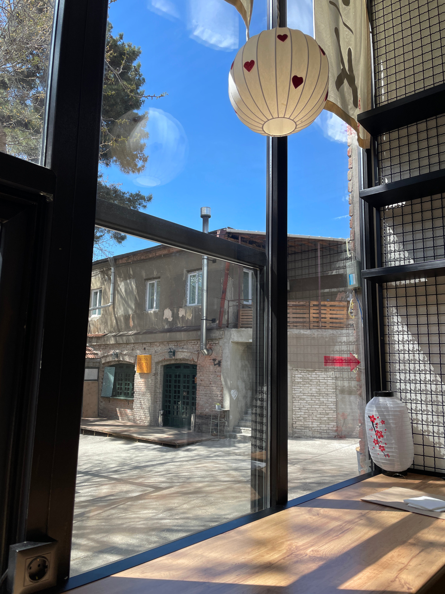 From an interior perspective, the image captures a view out a window, revealing aspects of the city of Tbilisi, Georgia. A round paper lantern adorned with heart shapes hangs near the window, contrast…read more