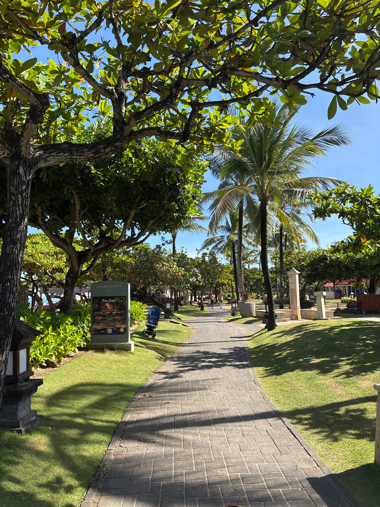 The image depicts a scene along a paved pathway in Kuta Selatan, Indonesia. The path is lined with green grass, trees, and vegetation. Palm trees are visible in the distance, and shadows from trees arβ¦read more