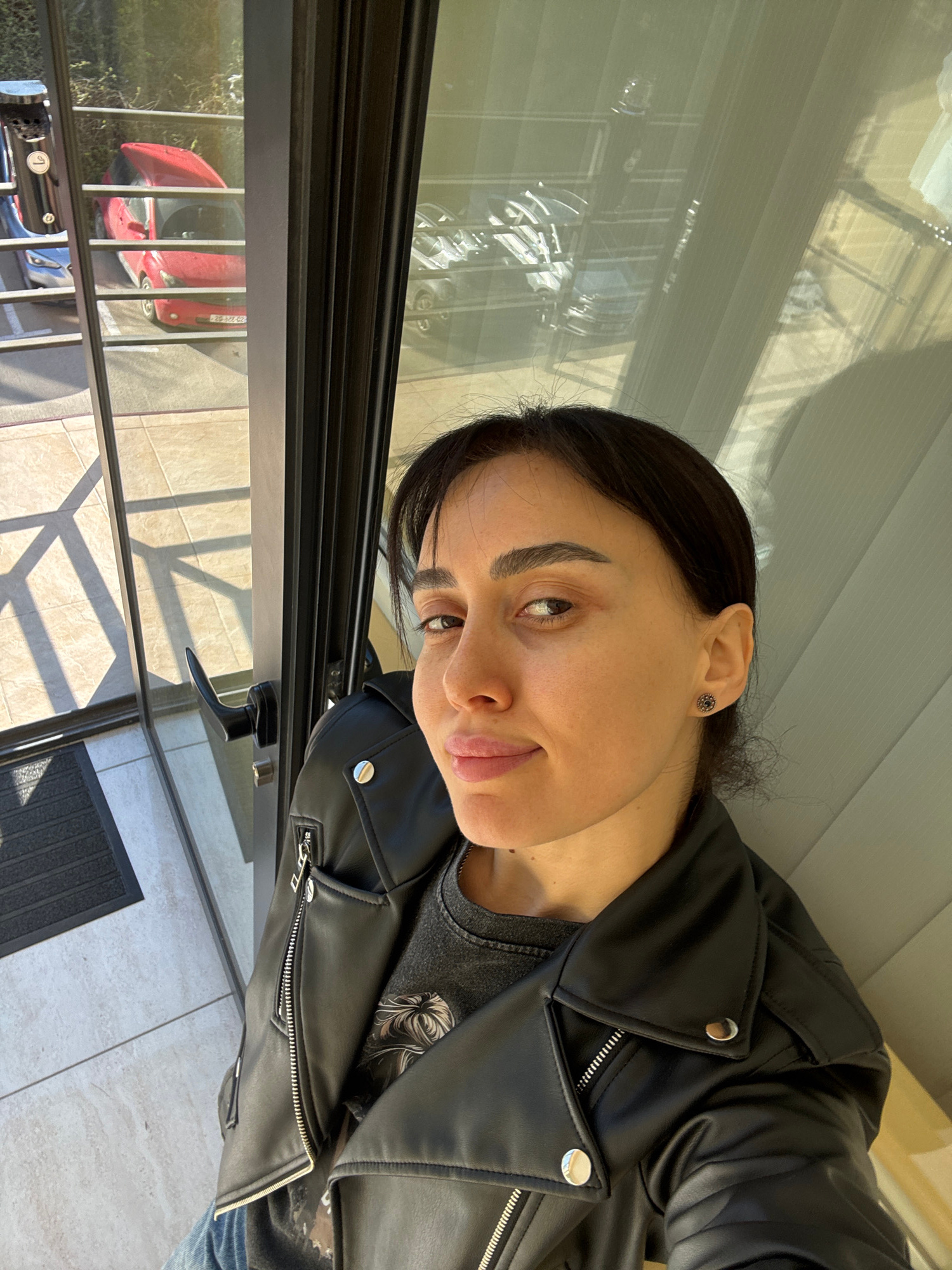 A woman with dark hair and fair skin stands facing the camera, wearing a black leather jacket over a gray patterned t-shirt. She is positioned indoors, near a window or glass barrier that reflects an…read more
