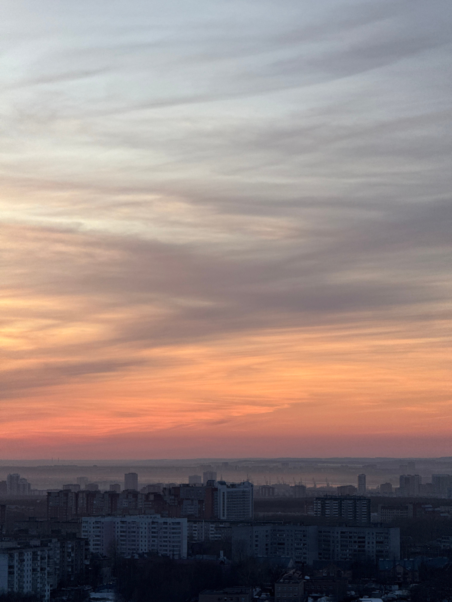 The image displays an expansive high-angle view of the city of Perm, Russia, at either sunrise or sunset. The sky occupies approximately the upper two-thirds of the frame, exhibiting a prominent colorβ¦read more