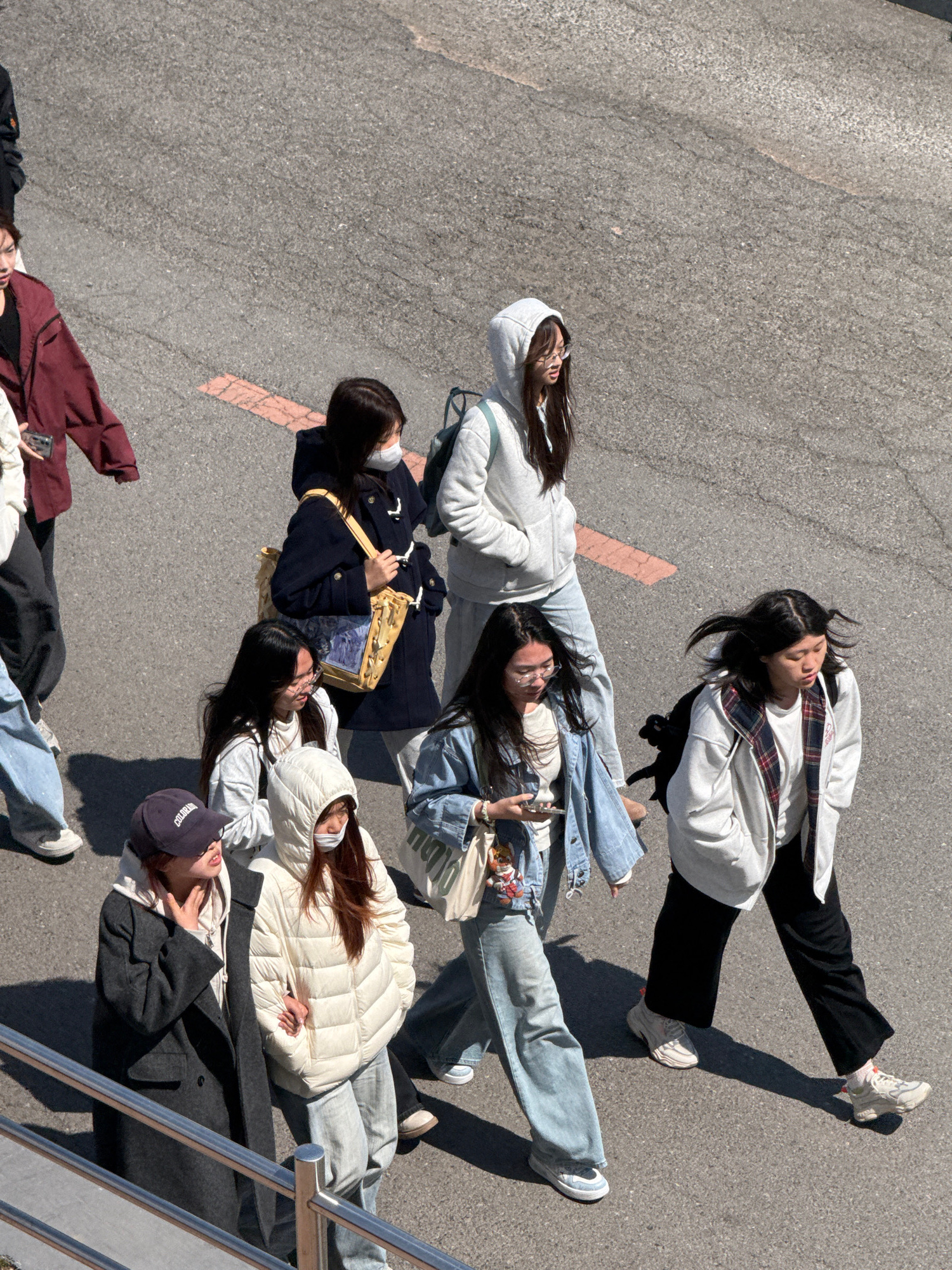 An overhead shot shows six people lying on an asphalt surface. A painted peach-colored line is visible near the center of the image. The people appear to be grouped casually, with varied clothing and…read more