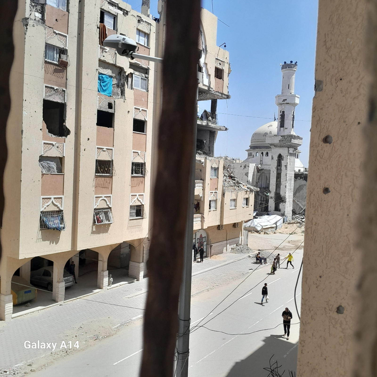 The image, taken from an elevated position in Khan Yunis, Palestinian Territory, shows a street scene with significant structural damage to buildings. A mosque with a prominent minaret and dome stands…read more