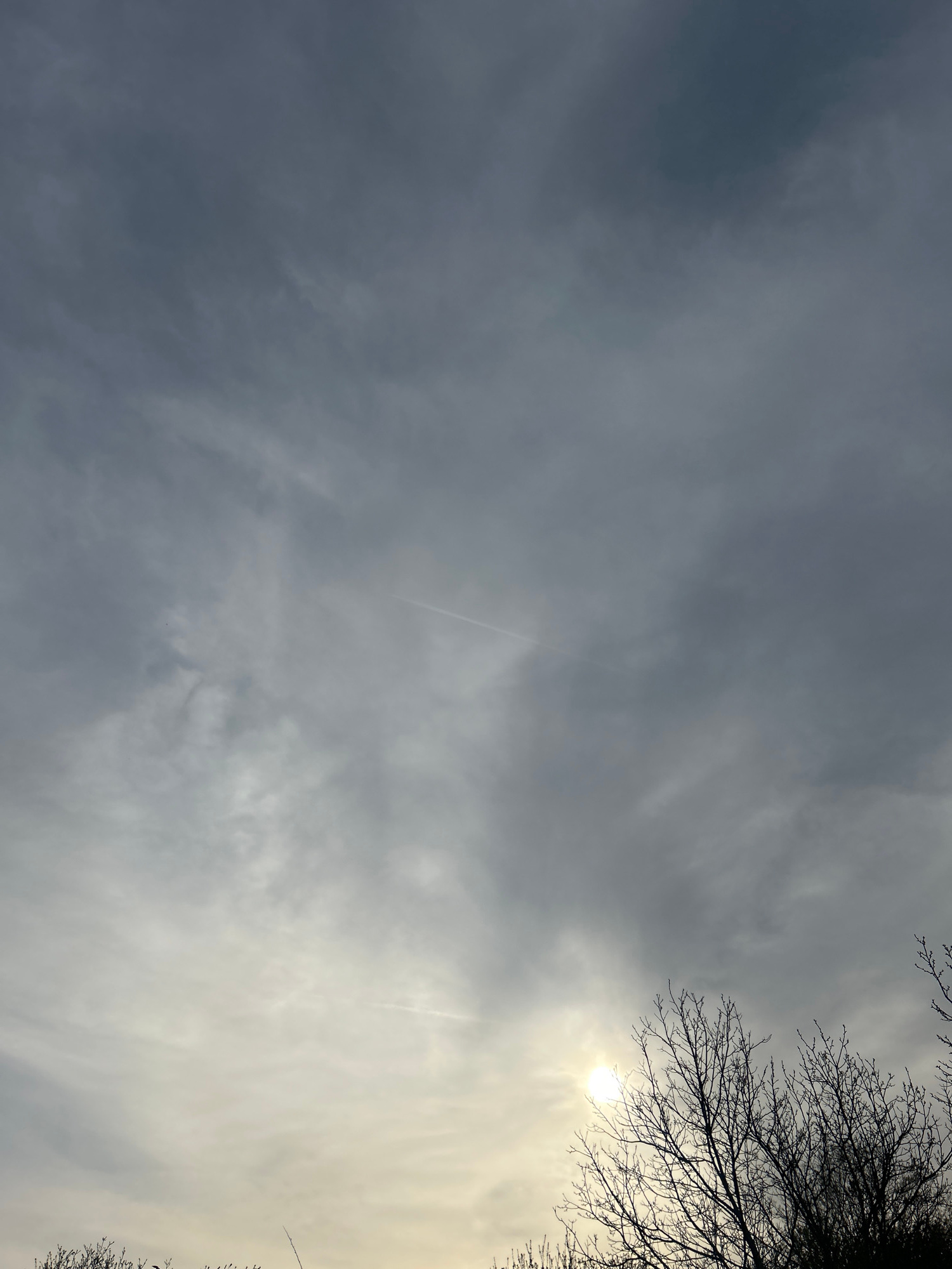 The image shows a sky view, seemingly taken from the city of Unknown, Unknown. Predominantly cloudy, with varying shades of grey, the sky shows a break in the cloud cover where the sun is weakly visib…read more