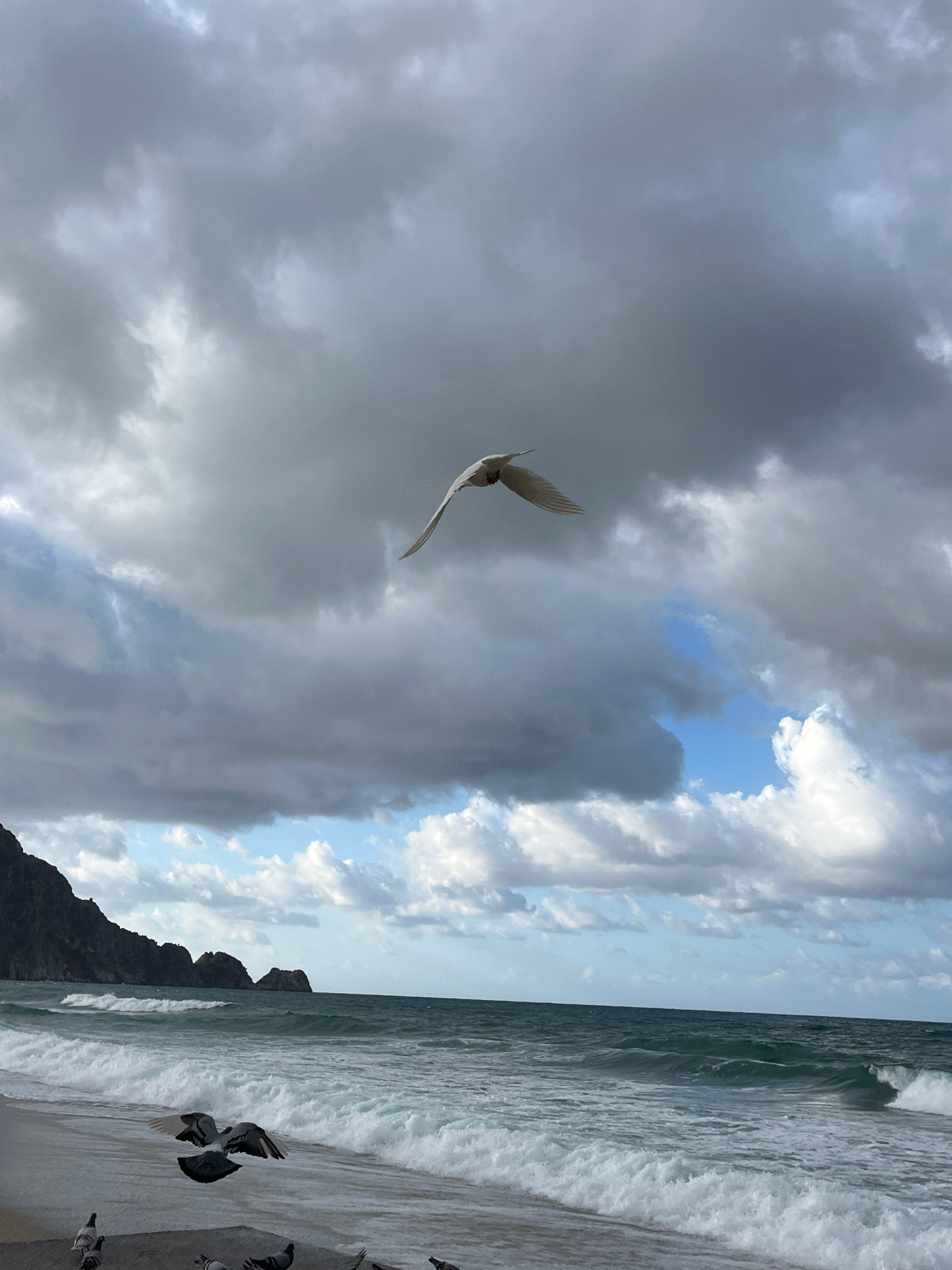 The image shows a cloudy sky above a beach in Alanya, Turkey. The sea has waves crashing onto the shoreline. A rocky headland rises from the beach. A flock of pigeons occupies the right side of the sh…read more