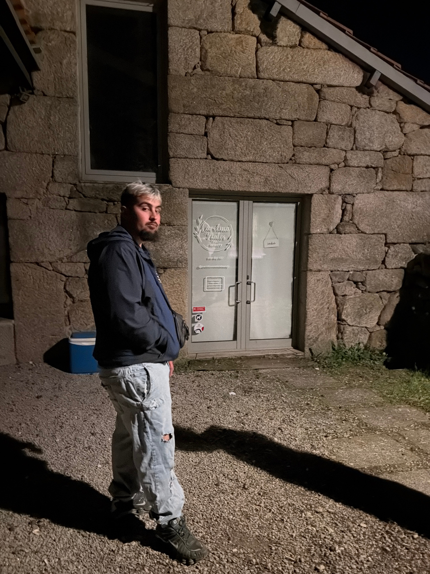 A man stands in front of a stone building with a window and a glass door. He wears a dark jacket, light-colored ripped jeans, and dark shoes. The ground is gravel. The building is likely located in Vi…read more
