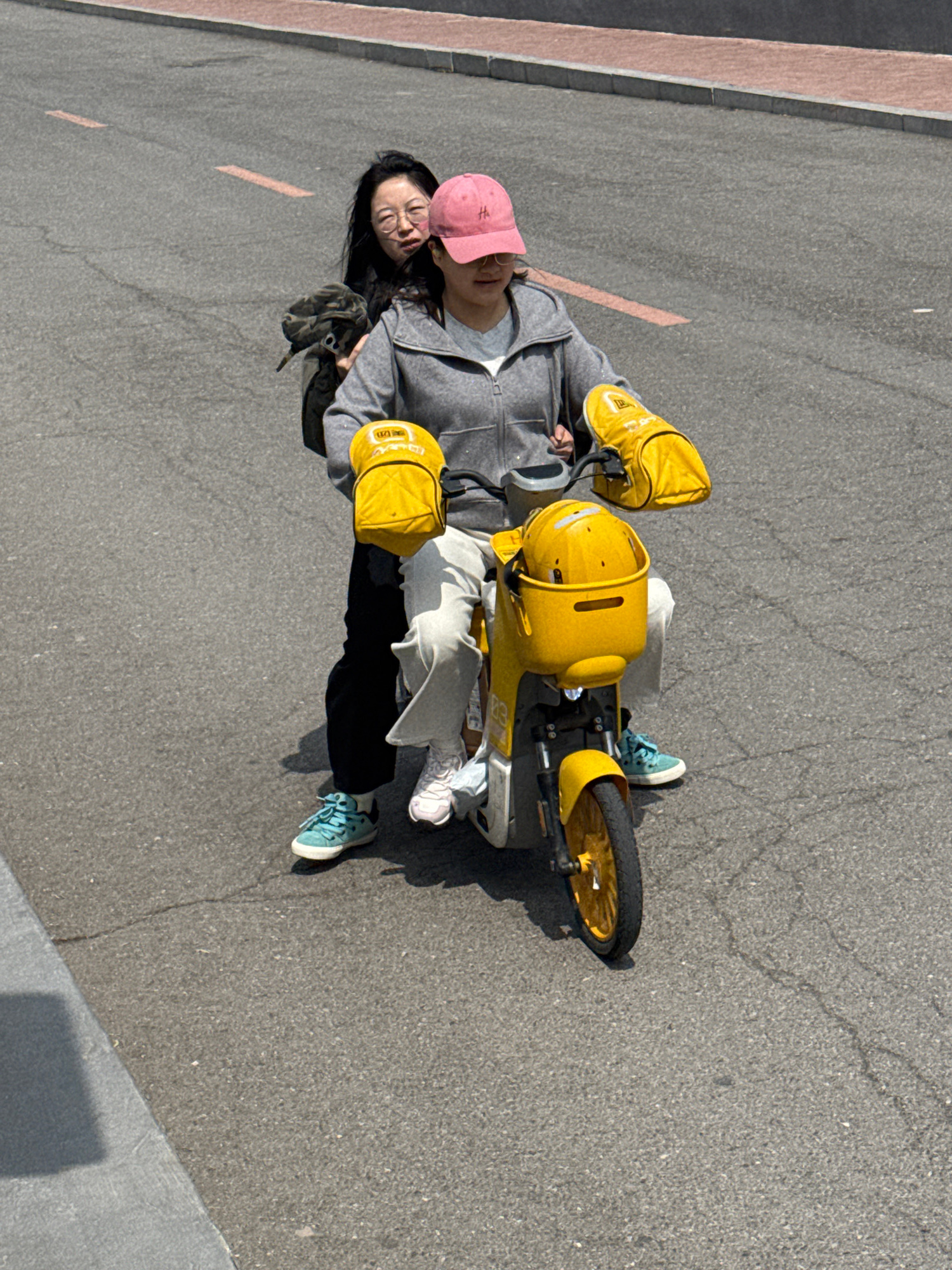 The image, best viewed rotated 90 degrees counter-clockwise, depicts two individuals, likely women, resting outdoors next to a prominent bright yellow electric scooter on an asphalt surface under clea…read more