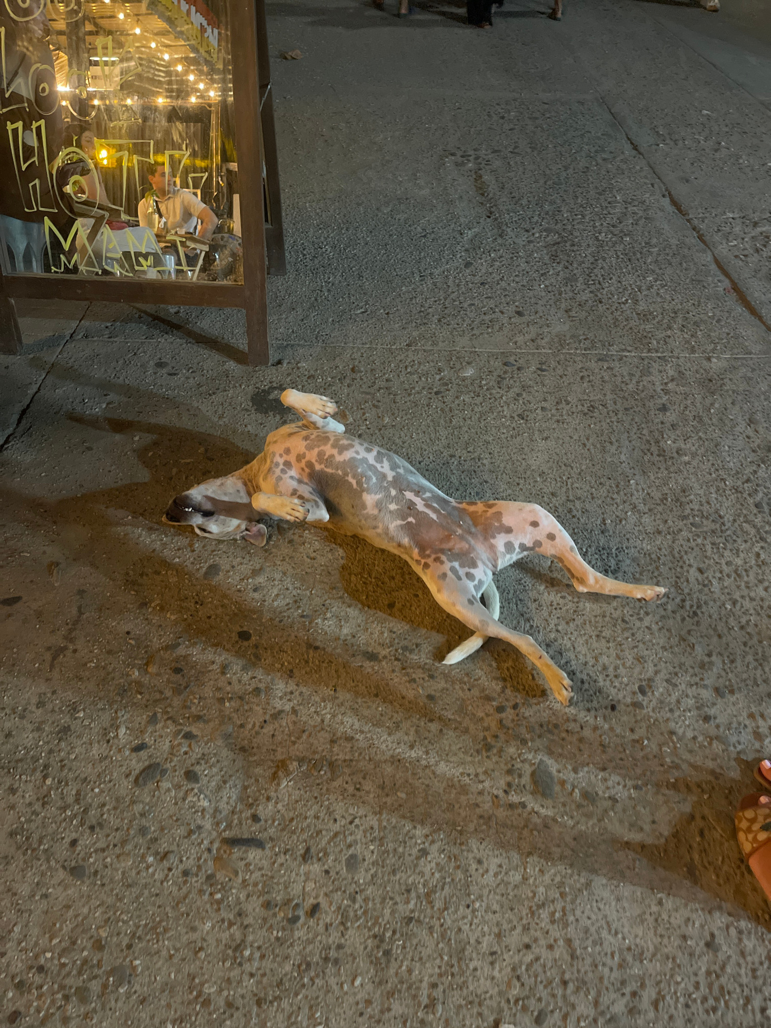 A dog lies on its back on a concrete surface. The dog is light-colored with spots and its paws are outstretched. A person's foot is visible in the upper right corner. A storefront with lights and writ…read more