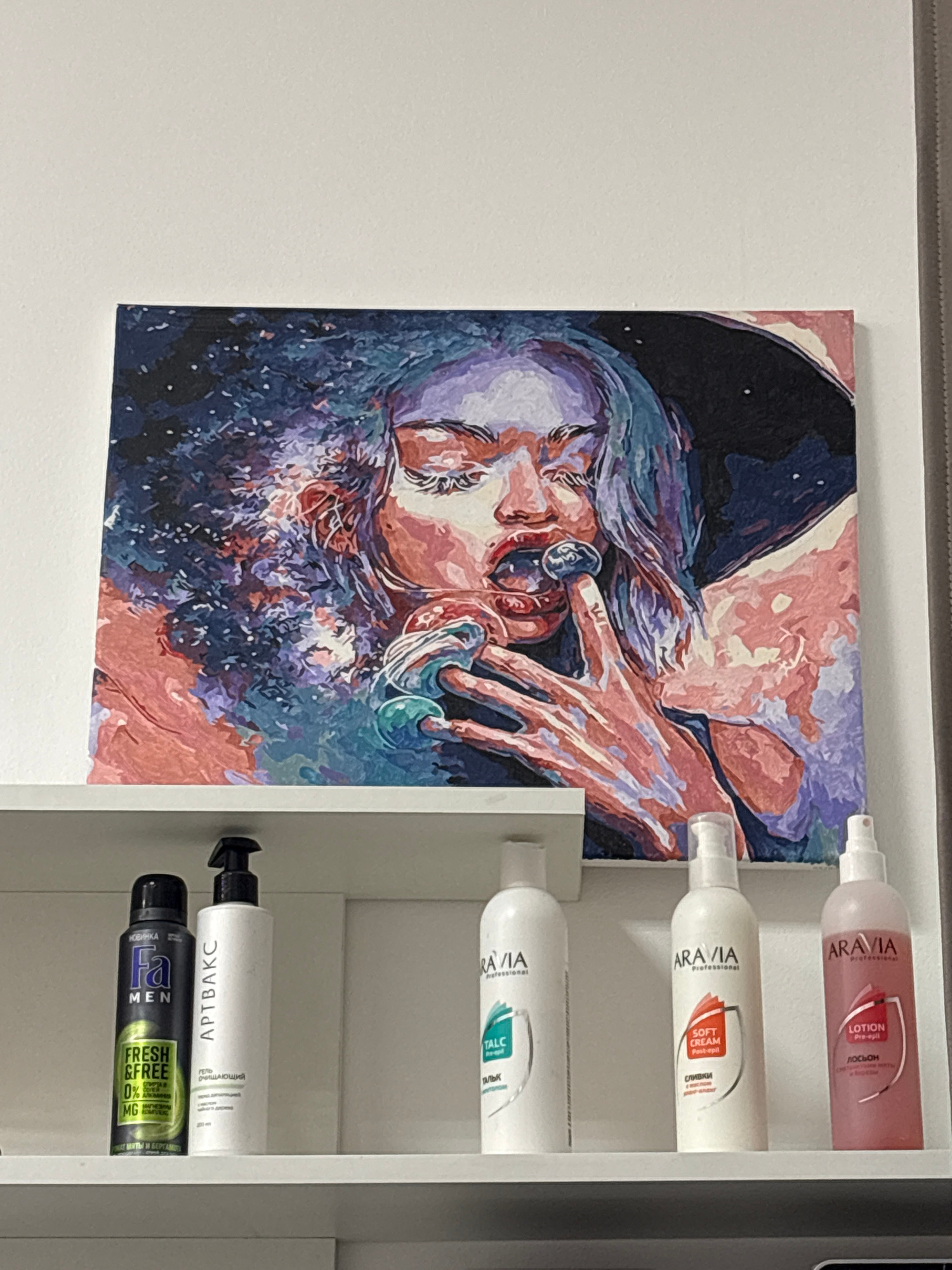 The image displays an indoor scene, likely in Perm, Russia, featuring a vibrant painting alongside a shelf of personal care products. The main subject is a large, multi-colored painting depicting a wo…read more
