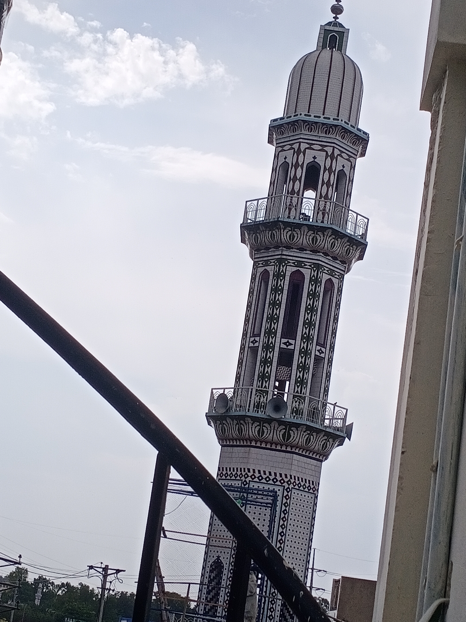 This image captures a tall, ornate minaret, likely part of a mosque, situated in Farooqabad, Pakistan. The minaret stands prominently against a bright, partly cloudy sky, showcasing intricate architec…read more
