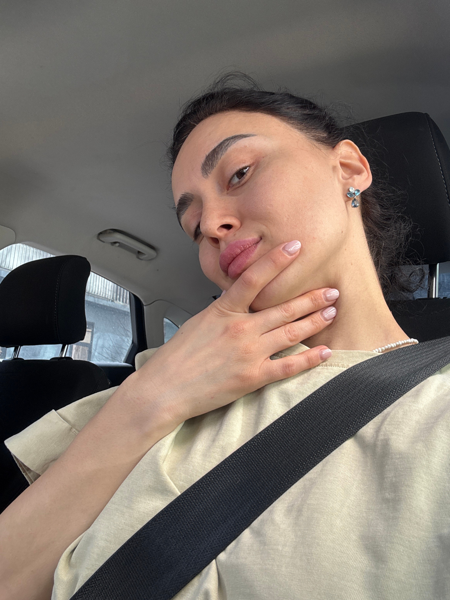 A person with dark hair and pronounced eyebrows is seated in a car, wearing a light-colored shirt and a seatbelt. Their left hand is touching their face. The background shows a blurred view of a city,…read more