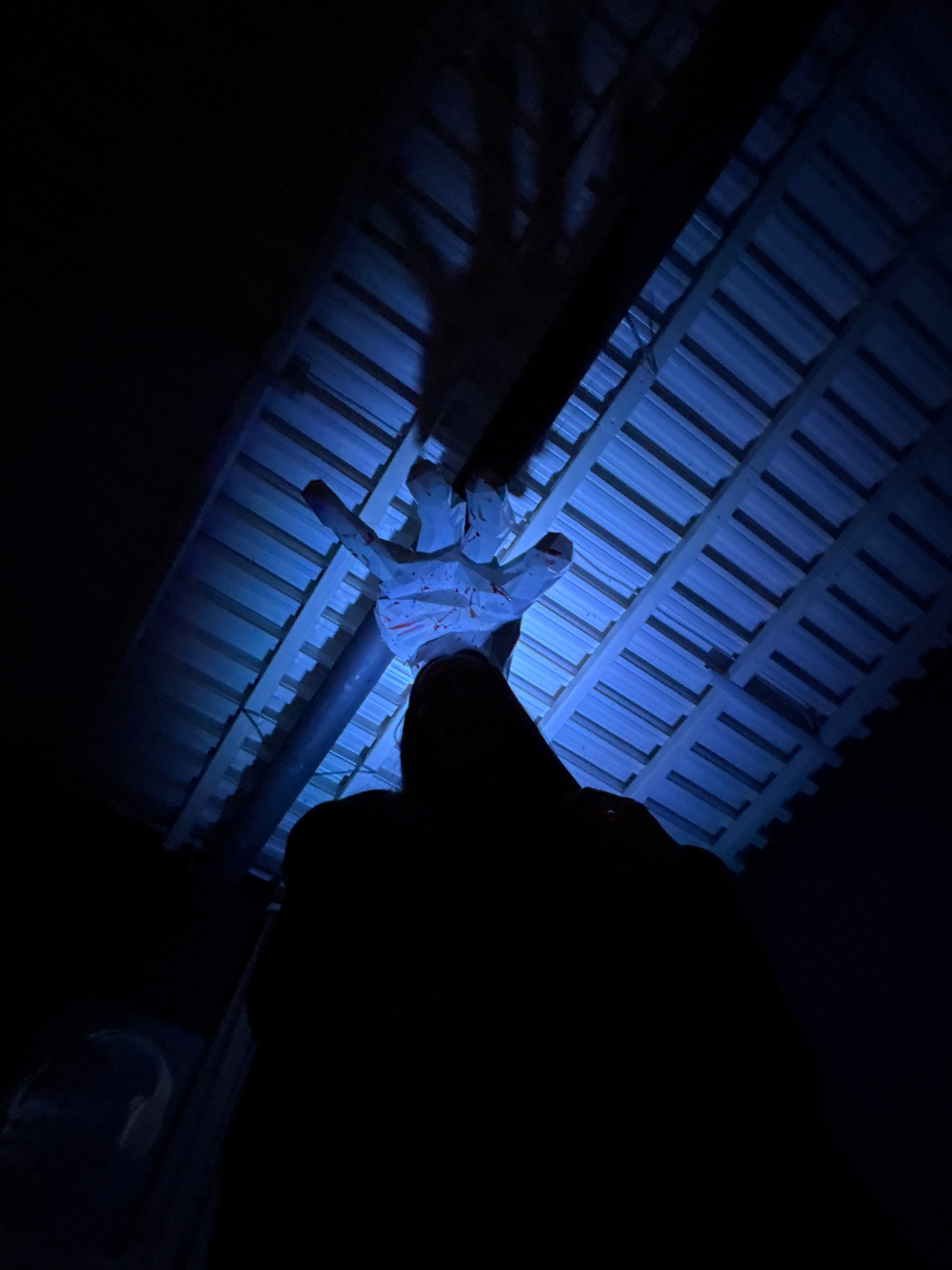 A low-angle, poorly illuminated image shows a silhouette of a person's head in the foreground, dominating the right side of the frame. The background depicts a corrugated metal ceiling illuminated wit…read more