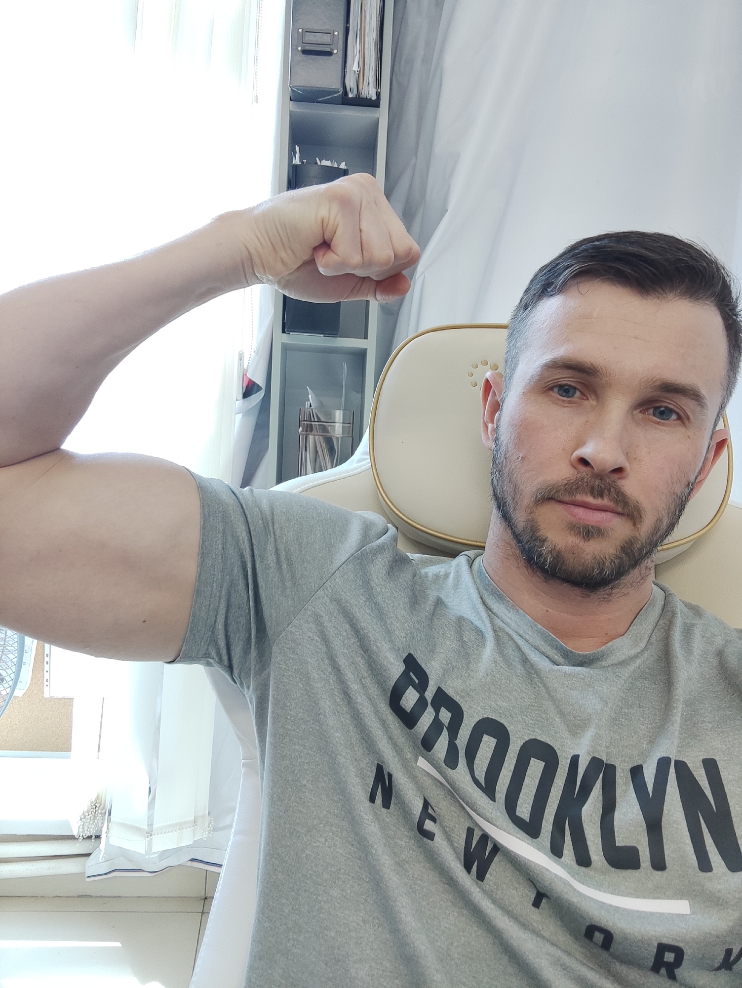 A man is posing for a selfie. He is sitting in a chair with a cream-colored back, wearing a gray t-shirt with "BROOKLYN NEW YORK" printed on it. He is flexing his left bicep. Behind him is a white cab…read more
