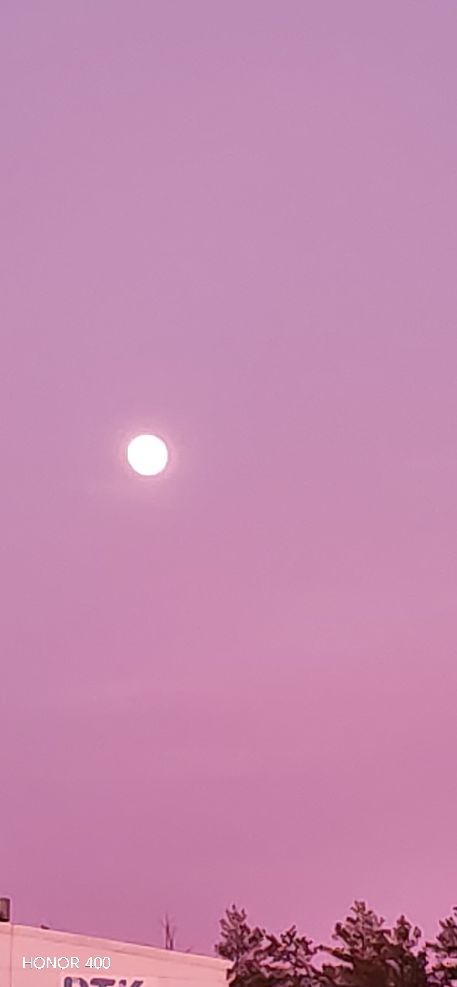 The image shows a pale, almost lilac sky with a bright, circular light source, presumably the moon. In the lower portion of the image, outlines of trees with possible snow covering the branches are vi…read more