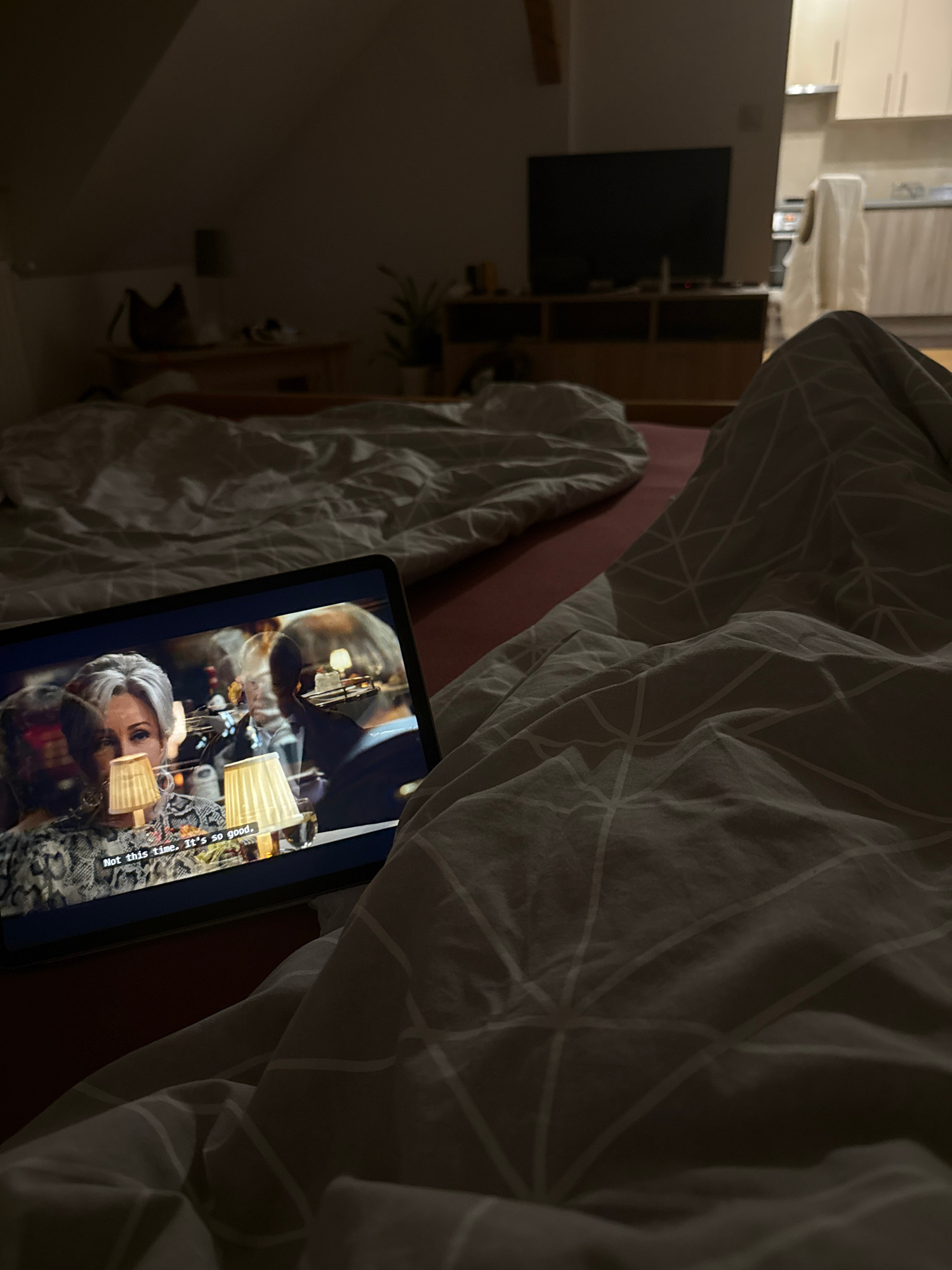 A tablet rests atop bedding, displaying a scene from a television show or movie. The screen shows an older woman with white hair in a gray and white patterned top, illuminated by a table lamp. Part of…read more